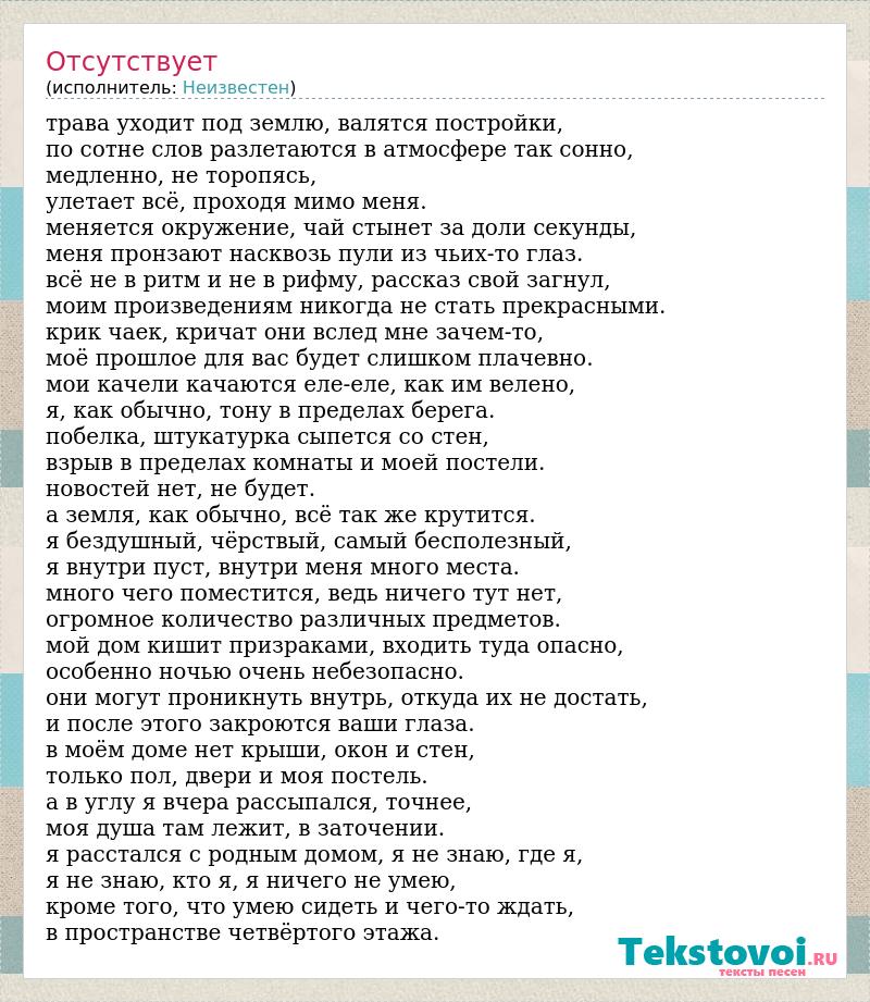 трава уходит под землю, валятся постройки, по сотне слов разлетаются в атмосфере так сонно, медленно, не торопясь, улетает всё, проходя мимо меня. меняется окружение, чай стынет за доли секунды, меня пронзают насквозь пули из чьих-то глаз. всё не в ритм и не в рифму, рассказ свой загнул, моим произведениям никогда не стать прекрасными. крик чаек, кричат они вслед мне зачем-то, моё прошлое для вас будет слишком плачевно. мои качели качаются еле-еле, как им велено, я, как обычно, тону в пределах берега. побелка, штукатурка сыпется со стен, взрыв в пределах комнаты и моей постели. новостей нет, не будет. а земля, как обычно, всё так же крутится. я бездушный, чёрствый, самый бесполезный, я внутри пуст, внутри меня много места. много чего поместится, ведь ничего тут нет, огромное количество различных предметов. мой дом кишит призраками, входить туда опасно, особенно ночью очень небезопасно. они могут проникнуть внутрь, откуда их не достать, и после этого закроются ваши глаза. в моём доме нет крыши, окон и стен, только пол, двери и моя постель. а в углу я вчера рассыпался, точнее, моя душа там лежит, в заточении. я расстался с родным домом, я не знаю, где я, я не знаю, кто я, я ничего не умею, кроме того, что умею сидеть и чего-то ждать, в пространстве четвёртого этажа.
