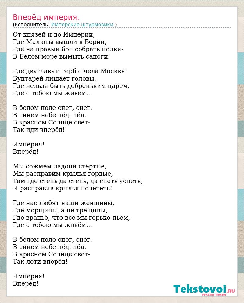 От князей и до Империи, Где Малюты вышли в Берии, Где на правый бой собрать полки- В Белом море вымыть сапоги. Где двуглавый герб с чела Москвы Бунтарей лишает головы, Где нельзя быть добреньким царем, Где с тобою мы живем… В белом поле снег, снег. В синем небе лёд, лёд. В красном Солнце свет- Так иди вперёд! Империя! Вперёд! Мы сожмём ладони стёртые, Мы расправим крылья гордые, Там где степь да степь, да спеть успеть, И расправив крылья полететь! Где нас любят наши женщины, Где морщины, а не трещины, Где враньё, что все мы горько пьём, Где с тобою мы живём… В белом поле снег, снег. В синем небе лёд, лёд. В красном Солнце свет- Так лети вперёд! Империя! Вперёд!