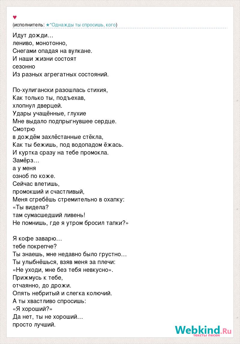 Идут дожди… лениво, монотонно, Снегами опадая на вулкане. И наши жизни состоят сезонно Из разных агрегатных состояний. По-хулигански разошлась стихия, Как только ты, подъехав, хлопнул дверцей. Удары учащённые, глухие Мне выдало подпрыгнувшее сердце. Смотрю в дождём захлёстанные стёкла, Как ты бежишь, под водопадом ёжась. И куртка сразу на тебе промокла. Замёрз… а у меня озноб по коже. Сейчас влетишь, промокший и счастливый, Меня сгребёшь стремительно в охапку: «Ты видела? там сумасшедший ливень! Не помнишь, где я утром бросил тапки?» Я кофе заварю… тебе покрепче? Ты знаешь, мне недавно было грустно… Ты улыбнёшься, взяв меня за плечи: «Не уходи, мне без тебя невкусно». Прижмусь к тебе, отчаянно, до дрожи. Опять небритый и слегка колючий. А ты хвастливо спросишь: «Я хороший?» Да нет, ты не хороший… просто лучший.
