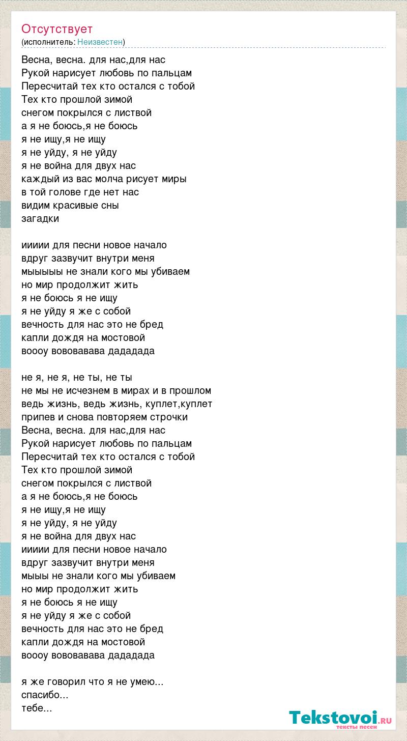 Весна, весна. для нас,для нас Рукой нарисует любовь по пальцам Пересчитай тех кто остался с тобой Тех кто прошлой зимой снегом покрылся с листвой а я не боюсь,я не боюсь я не ищу,я не ищу я не уйду, я не уйду я не война для двух нас каждый из вас молча рисует миры в той голове где нет нас видим красивые сны загадки иииии для песни новое начало вдруг зазвучит внутри меня мыыыыы не знали кого мы убиваем но мир продолжит жить я не боюсь я не ищу я не уйду я же с собой вечность для нас это не бред капли дождя на мостовой воооу вововавава дададада не я, не я, не ты, не ты не мы не исчезнем в мирах и в прошлом ведь жизнь, ведь жизнь, куплет,куплет припев и снова повторяем строчки Весна, весна. для нас,для нас Рукой нарисует любовь по пальцам Пересчитай тех кто остался с тобой Тех кто прошлой зимой снегом покрылся с листвой а я не боюсь,я не боюсь я не ищу,я не ищу я не уйду, я не уйду я не война для двух нас иииии для песни новое начало вдруг зазвучит внутри меня мыыы не знали кого мы убиваем но мир продолжит жить я не боюсь я не ищу я не уйду я же с собой вечность для нас это не бред капли дождя на мостовой воооу вововавава дададада я же говорил что я не умею... спасибо... тебе...