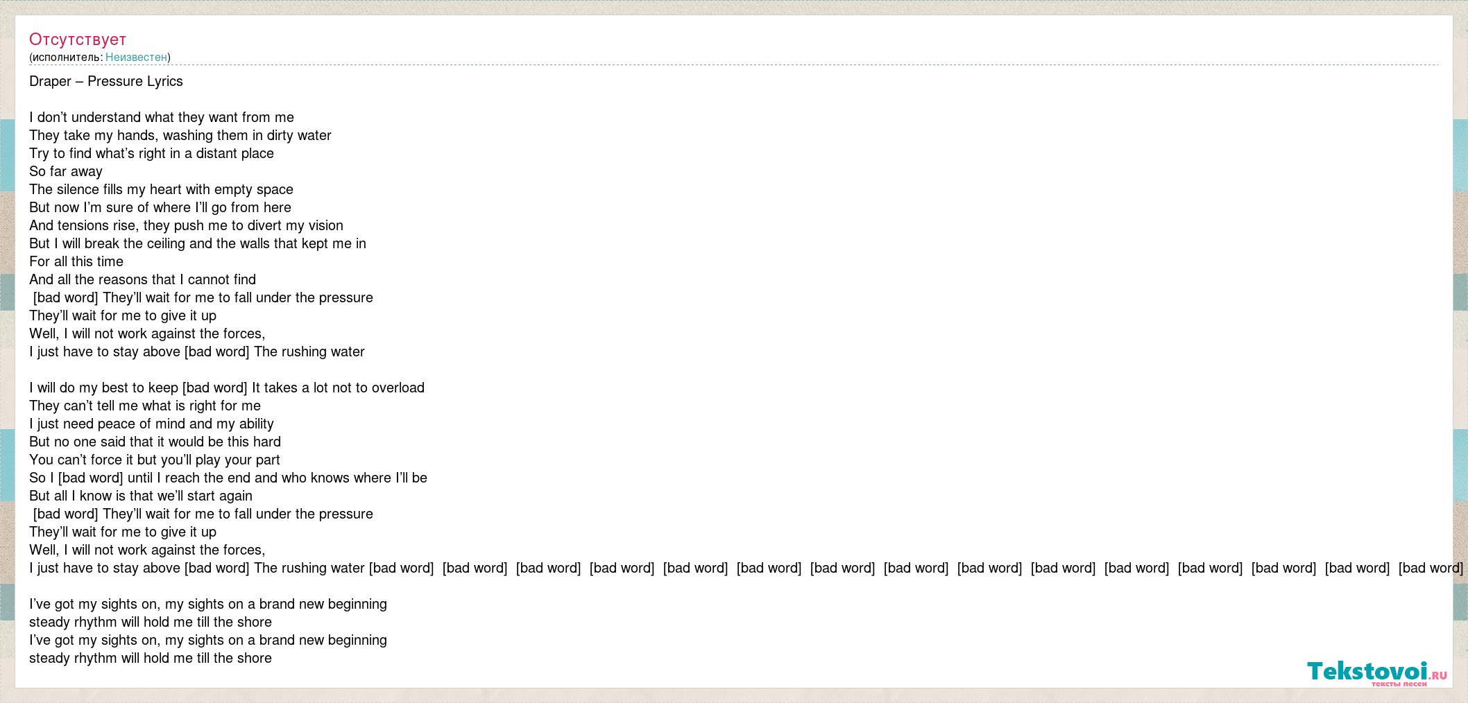 Draper – Pressure Lyrics I don’t understand what they want from me They take my hands, washing them in dirty water Try to find what’s right in a distant place So far away The silence fills my heart with empty space But now I’m sure of where I’ll go from here And tensions rise, they push me to divert my vision But I will break the ceiling and the walls that kept me in For all this time And all the reasons that I cannot find [bad word] They’ll wait for me to fall under the pressure They’ll wait for me to give it up Well, I will not work against the forces, I just have to stay above [bad word] The rushing water I will do my best to keep [bad word] It takes a lot not to overload They can’t tell me what is right for me I just need peace of mind and my ability But no one said that it would be this hard You can’t force it but you’ll play your part So I [bad word] until I reach the end and who knows where I’ll be But all I know is that we’ll start again [bad word] They’ll wait for me to fall under the pressure They’ll wait for me to give it up Well, I will not work against the forces, I just have to stay above [bad word] The rushing water [bad word] [bad word] [bad word] [bad word] [bad word] [bad word] [bad word] [bad word] [bad word] [bad word] [bad word] [bad word] [bad word] [bad word] [bad word] I’ve got my sights on, my sights on a brand new beginning steady rhythm will hold me till the shore I’ve got my sights on, my sights on a brand new beginning steady rhythm will hold me till the shore