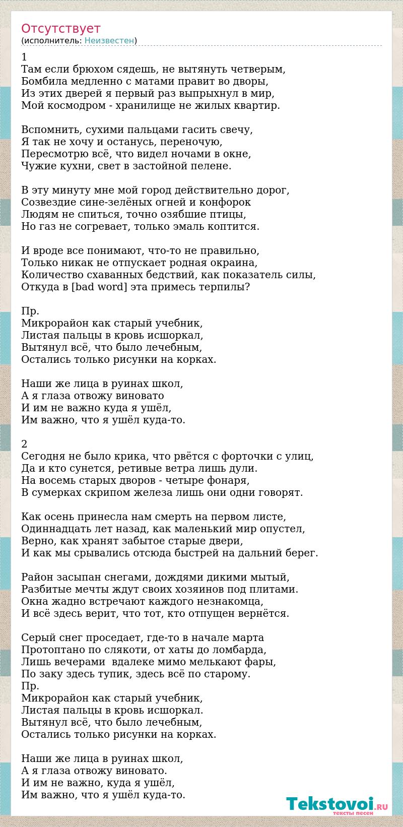 1 Там если брюхом сядешь, не вытянуть четверым, Бомбила медленно с матами правит во дворы, Из этих дверей я первый раз выпрыхнул в мир, Мой космодром - хранилище не жилых квартир. Вспомнить, сухими пальцами гасить свечу, Я так не хочу и останусь, переночую, Пересмотрю всё, что видел ночами в окне, Чужие кухни, свет в застойной пелене. В эту минуту мне мой город действительно дорог, Созвездие сине-зелёных огней и конфорок Людям не спиться, точно озябшие птицы, Но газ не согревает, только эмаль коптится. И вроде все понимают, что-то не правильно, Только никак не отпускает родная окраина, Количество схаванных бедствий, как показатель силы, Откуда в [bad word] эта примесь терпилы? Пр. Микрорайон как старый учебник, Листая пальцы в кровь исшоркал, Вытянул всё, что было лечебным, Остались только рисунки на корках. Наши же лица в руинах школ, А я глаза отвожу виновато И им не важно куда я ушёл, Им важно, что я ушёл куда-то. 2 Сегодня не было крика, что рвётся с форточки с улиц, Да и кто сунется, ретивые ветра лишь дули. На восемь старых дворов - четыре фонаря, В сумерках скрипом железа лишь они одни говорят. Как осень принесла нам смерть на первом листе, Одиннадцать лет назад, как маленький мир опустел, Верно, как хранят забытое старые двери, И как мы срывались отсюда быстрей на дальний берег. Район засыпан снегами, дождями дикими мытый, Разбитые мечты ждут своих хозяинов под плитами. Окна жадно встречают каждого незнакомца, И всё здесь верит, что тот, кто отпущен вернётся. Серый снег проседает, где-то в начале марта Протоптано по слякоти, от хаты до ломбарда, Лишь вечерами вдалеке мимо мелькают фары, По заку здесь тупик, здесь всё по старому. Пр. Микрорайон как старый учебник, Листая пальцы в кровь исшоркал. Вытянул всё, что было лечебным, Остались только рисунки на корках. Наши же лица в руинах школ, А я глаза отвожу виновато. И им не важно, куда я ушёл, Им важно, что я ушёл куда-то.