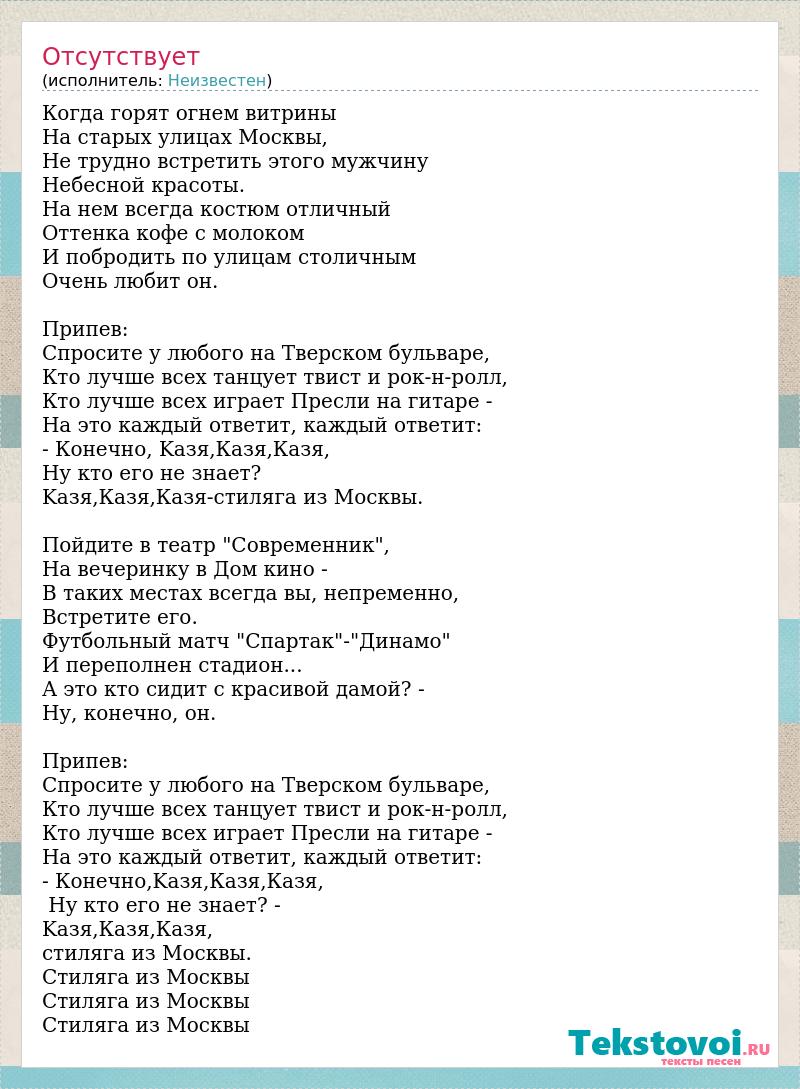 Когда горят огнем витрины Hа старых улицах Москвы, Hе трудно встретить этого мужчину Hебесной красоты. Hа нем всегда костюм отличный Оттенка кофе с молоком И побродить по улицам столичным Очень любит он. Припев: Спросите у любого на Тверском бульваре, Кто лучше всех танцует твист и рок-н-ролл, Кто лучше всех играет Пресли на гитаре - Hа это каждый ответит, каждый ответит: - Конечно, Kaзя,Казя,Казя, Hу кто его не знает? Kaзя,Казя,Казя-стиляга из Москвы. Пойдите в театр "Современник", Hа вечеринку в Дом кино - В таких местах всегда вы, непременно, Встретите его. Футбольный матч "Спартак"-"Динамо" И переполнен стадион... А это кто сидит с красивой дамой? - Hу, конечно, он. Припев: Спросите у любого на Тверском бульваре, Кто лучше всех танцует твист и рок-н-ролл, Кто лучше всех играет Пресли на гитаре - Hа это каждый ответит, каждый ответит: - Конечно,Kaзя,Казя,Казя, Hу кто его не знает? - Kaзя,Казя,Казя, стиляга из Москвы. Стиляга из Москвы Стиляга из Москвы Стиляга из Москвы