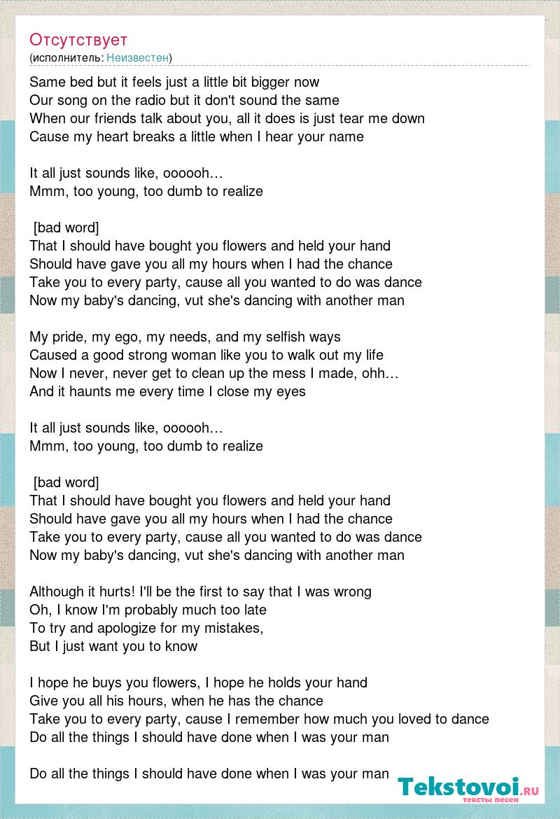 Same bed but it feels just a little bit bigger now Our song on the radio but it don't sound the same When our friends talk about you, all it does is just tear me down Cause my heart breaks a little when I hear your name It all just sounds like, oooooh… Mmm, too young, too dumb to realize [bad word] That I should have bought you flowers and held your hand Should have gave you all my hours when I had the chance Take you to every party, cause all you wanted to do was dance Now my baby's dancing, vut she's dancing with another man My pride, my ego, my needs, and my selfish ways Caused a good strong woman like you to walk out my life Now I never, never get to clean up the mess I made, ohh… And it haunts me every time I close my eyes It all just sounds like, oooooh… Mmm, too young, too dumb to realize [bad word] That I should have bought you flowers and held your hand Should have gave you all my hours when I had the chance Take you to every party, cause all you wanted to do was dance Now my baby's dancing, vut she's dancing with another man Although it hurts! I'll be the first to say that I was wrong Oh, I know I'm probably much too late To try and apologize for my mistakes, But I just want you to know I hope he buys you flowers, I hope he holds your hand Give you all his hours, when he has the chance Take you to every party, cause I remember how much you loved to dance Do all the things I should have done when I was your man Do all the things I should have done when I was your man