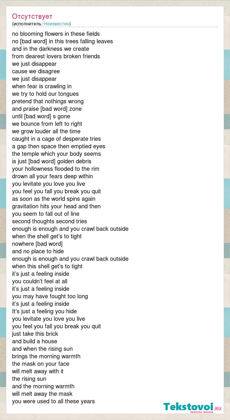 no blooming flowers in these fields no [bad word] in this trees falling leaves and in the darkness we create from dearest lovers broken friends we just disappear cause we disagree we just disappear when fear is crawling in we try to hold our tongues pretend that nothings wrong and praise [bad word] zone until [bad word] s gone we bounce from left to right we grow louder all the time caught in a cage of desperate tries a gap then space then emptied eyes the temple which your body seems is just [bad word] golden debris your hollowness flooded to the rim drown all your fears deep within you levitate you love you live you feel you fall you break you quit as soon as the world spins again gravitation hits your head and then you seem to fall out of line second thoughts second tries enough is enough and you crawl back outside when the shell get’s to tight nowhere [bad word] and no place to hide enough is enough and you crawl back outside when this shell get’s to tight it’s just a feeling inside you couldn’t feel at all it’s just a feeling inside you may have fought too long it’s just a feeling inside It’s just a feeling you hide you levitate you love you live you feel you fall you break you quit just take this brick and build a house and when the rising sun brings the morning warmth the mask on your face will melt away with it the rising sun and the morning warmth will melt away the mask you were used to all these years