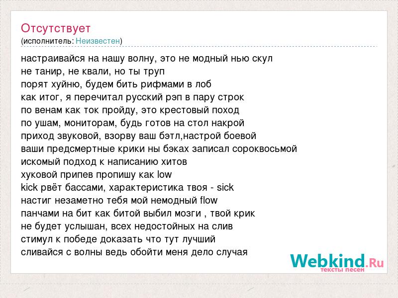 настраивайся на нашу волну, это не модный нью скул не танир, не квали, но ты труп порят хуйню, будем бить рифмами в лоб как итог, я перечитал русский рэп в пару строк по венам как ток пройду, это крестовый поход по ушам, мониторам, будь готов на стол накрой приход звуковой, взорву ваш бэтл,настрой боевой ваши предсмертные крики ны бэках записал сороквосьмой искомый подход к написанию хитов хуковой припев пропишу как low kick рвёт бассами, характеристика твоя - sick настиг незаметно тебя мой немодный flow панчами на бит как битой выбил мозги , твой крик не будет услышан, всех недостойных на слив стимул к победе доказать что тут лучший сливайся с волны ведь обойти меня дело случая