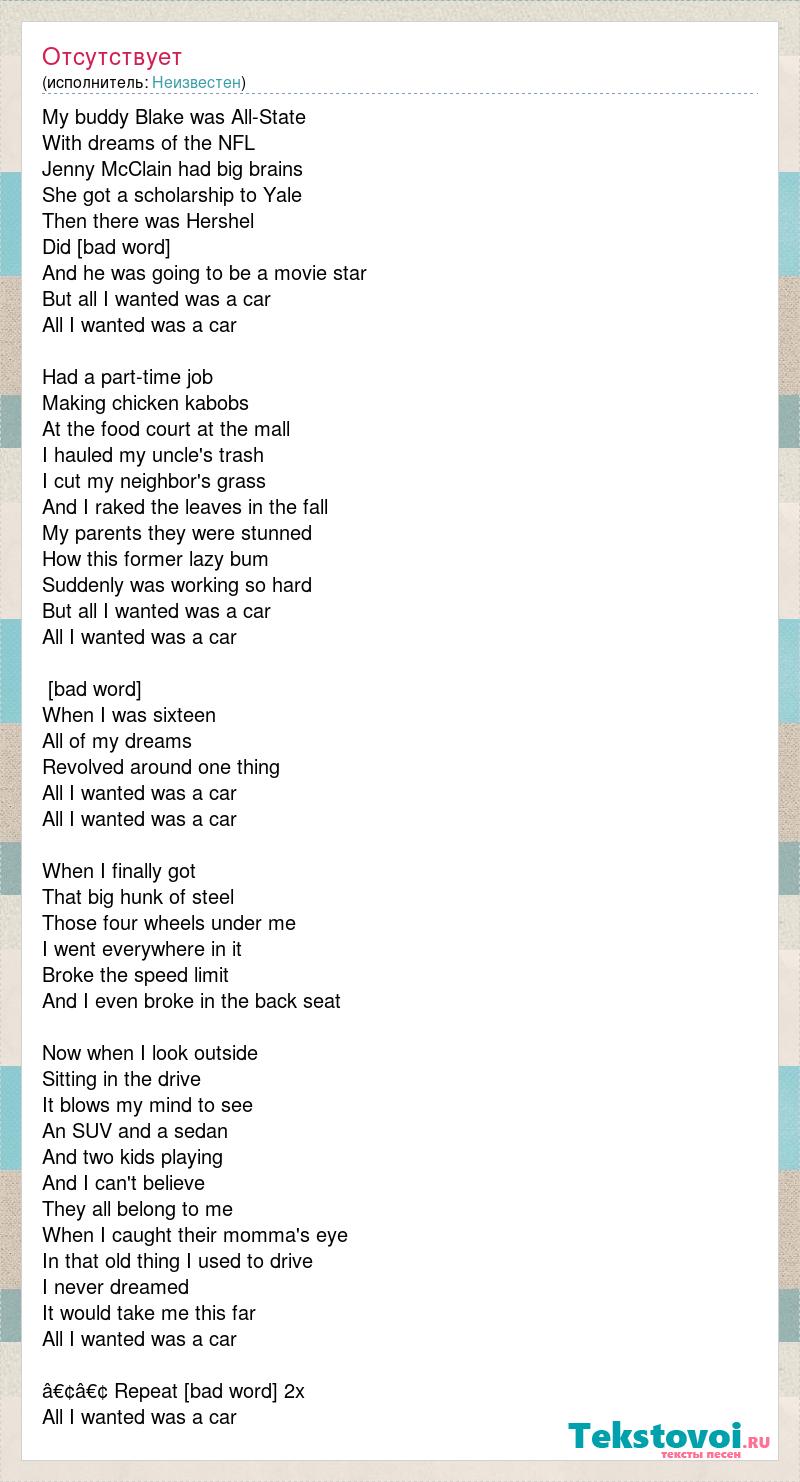 My buddy Blake was All-State With dreams of the NFL Jenny McClain had big brains She got a scholarship to Yale Then there was Hershel Did [bad word] And he was going to be a movie star But all I wanted was a car All I wanted was a car Had a part-time job Making chicken kabobs At the food court at the mall I hauled my uncle's trash I cut my neighbor's grass And I raked the leaves in the fall My parents they were stunned How this former lazy bum Suddenly was working so hard But all I wanted was a car All I wanted was a car [bad word] When I was sixteen All of my dreams Revolved around one thing All I wanted was a car All I wanted was a car When I finally got That big hunk of steel Those four wheels under me I went everywhere in it Broke the speed limit And I even broke in the back seat Now when I look outside Sitting in the drive It blows my mind to see An SUV and a sedan And two kids playing And I can't believe They all belong to me When I caught their momma's eye In that old thing I used to drive I never dreamed It would take me this far All I wanted was a car •• Repeat [bad word] 2x All I wanted was a car
