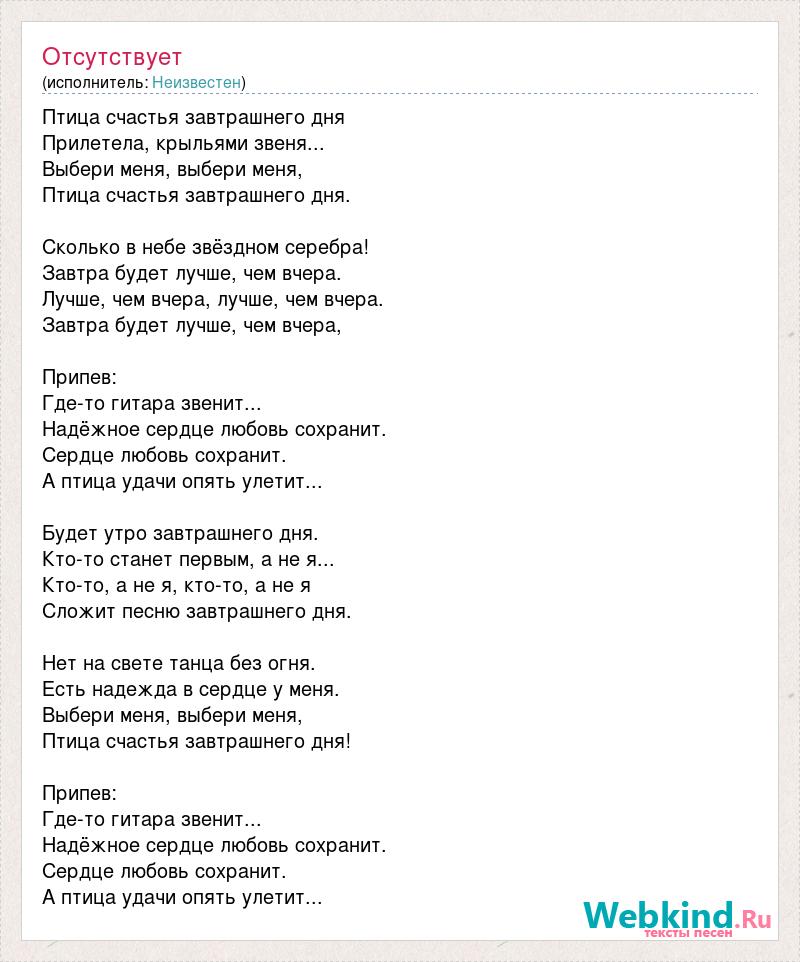Птица счастья завтрашнего дня Прилетела, крыльями звеня... Выбери меня, выбери меня, Птица счастья завтрашнего дня. Сколько в небе звёздном серебра! Завтра будет лучше, чем вчера. Лучше, чем вчера, лучше, чем вчера. Завтра будет лучше, чем вчера, Припев: Где-то гитара звенит... Надёжное сердце любовь сохранит. Сердце любовь сохранит. А птица удачи опять улетит... Будет утро завтрашнего дня. Кто-то станет первым, а не я... Кто-то, а не я, кто-то, а не я Сложит песню завтрашнего дня. Нет на свете танца без огня. Есть надежда в сердце у меня. Выбери меня, выбери меня, Птица счастья завтрашнего дня! Припев: Где-то гитара звенит... Надёжное сердце любовь сохранит. Сердце любовь сохранит. А птица удачи опять улетит...