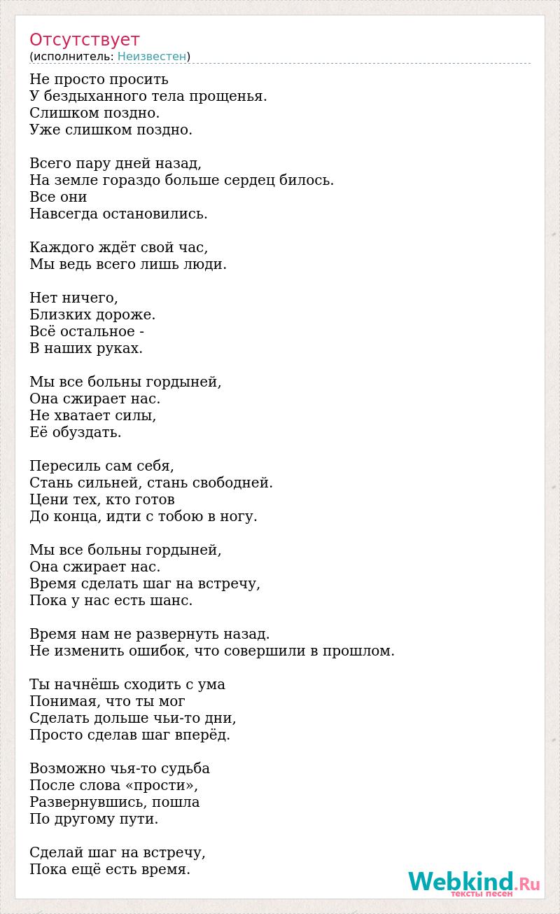 Не просто просить У бездыханного тела прощенья. Слишком поздно. Уже слишком поздно. Всего пару дней назад, На земле гораздо больше сердец билось. Все они Навсегда остановились. Каждого ждёт свой час, Мы ведь всего лишь люди. Нет ничего, Близких дороже. Всё остальное - В наших руках. Мы все больны гордыней, Она сжирает нас. Не хватает силы, Её обуздать. Пересиль сам себя, Стань сильней, стань свободней. Цени тех, кто готов До конца, идти с тобою в ногу. Мы все больны гордыней, Она сжирает нас. Время сделать шаг на встречу, Пока у нас есть шанс. Время нам не развернуть назад. Не изменить ошибок, что совершили в прошлом. Ты начнёшь сходить с ума Понимая, что ты мог Сделать дольше чьи-то дни, Просто сделав шаг вперёд. Возможно чья-то судьба После слова «прости», Развернувшись, пошла По другому пути. Сделай шаг на встречу, Пока ещё есть время.