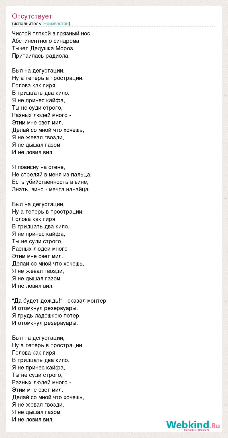 Чистой пяткой в грязный нос Абстинентного синдрома Тычет Дедушка Мороз. Притаилась радиола. Был на дегустации, Ну а теперь в прострации. Голова как гиря В тридцать два кило. Я не принес кайфа, Ты не суди строго, Разных людей много - Этим мне свет мил. Делай со мной что хочешь, Я не жевал гвозди, Я не дышал газом И не ловил вил. Я повисну на стене, Не стреляй в меня из пальца. Есть убийственность в вине, Знать, вино - мечта нанайца. Был на дегустации, Ну а теперь в прострации. Голова как гиря В тридцать два кило. Я не принес кайфа, Ты не суди строго, Разных людей много - Этим мне свет мил. Делай со мной что хочешь, Я не жевал гвозди, Я не дышал газом И не ловил вил. “Да будет дождь!” - сказал монтер И отомкнул резервуары. Я грудь ладошкою потер И отомкнул резервуары. Был на дегустации, Ну а теперь в прострации. Голова как гиря В тридцать два кило. Я не принес кайфа, Ты не суди строго, Разных людей много - Этим мне свет мил. Делай со мной что хочешь, Я не жевал гвозди, Я не дышал газом И не ловил вил.