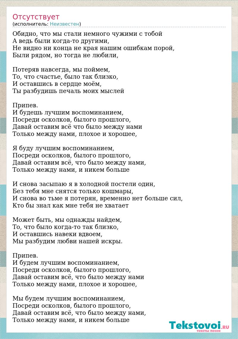 Обидно, что мы стали немного чужими с тобой А ведь были когда-то другими, Не видно ни конца не края нашим ошибкам порой, Были рядом, но тогда не любили, Потеряв навсегда, мы поймем, То, что счастье, было так близко, И оставшись в сердце моём, Ты разбудишь печаль моих мыслей Припев. И будешь лучшим воспоминанием, Посреди осколков, былого прошлого, Давай оставим всё что было между нами Только между нами, плохое и хорошее, Я буду лучшим воспоминанием, Посреди осколков, былого прошлого, Давай оставим всё, что было между нами, Только между нами, и никем больше И снова засыпаю я в холодной постели один, Без тебя мне снятся только кошмары, И снова во тьме я потерян, временно нет больше сил, Кто бы знал как мне тебя не хватает Может быть, мы однажды найдем, То, что было когда-то так близко, И оставшись навеки вдвоем, Мы разбудим любви нашей искры. Припев. И будем лучшим воспоминанием, Посреди осколков, былого прошлого, Давай оставим всё, что было между нами Только между нами, плохое и хорошее, Мы будем лучшим воспоминанием, Посреди осколков, былого прошлого, Давай оставим всё, что было между нами, Только между нами, и никем больше
