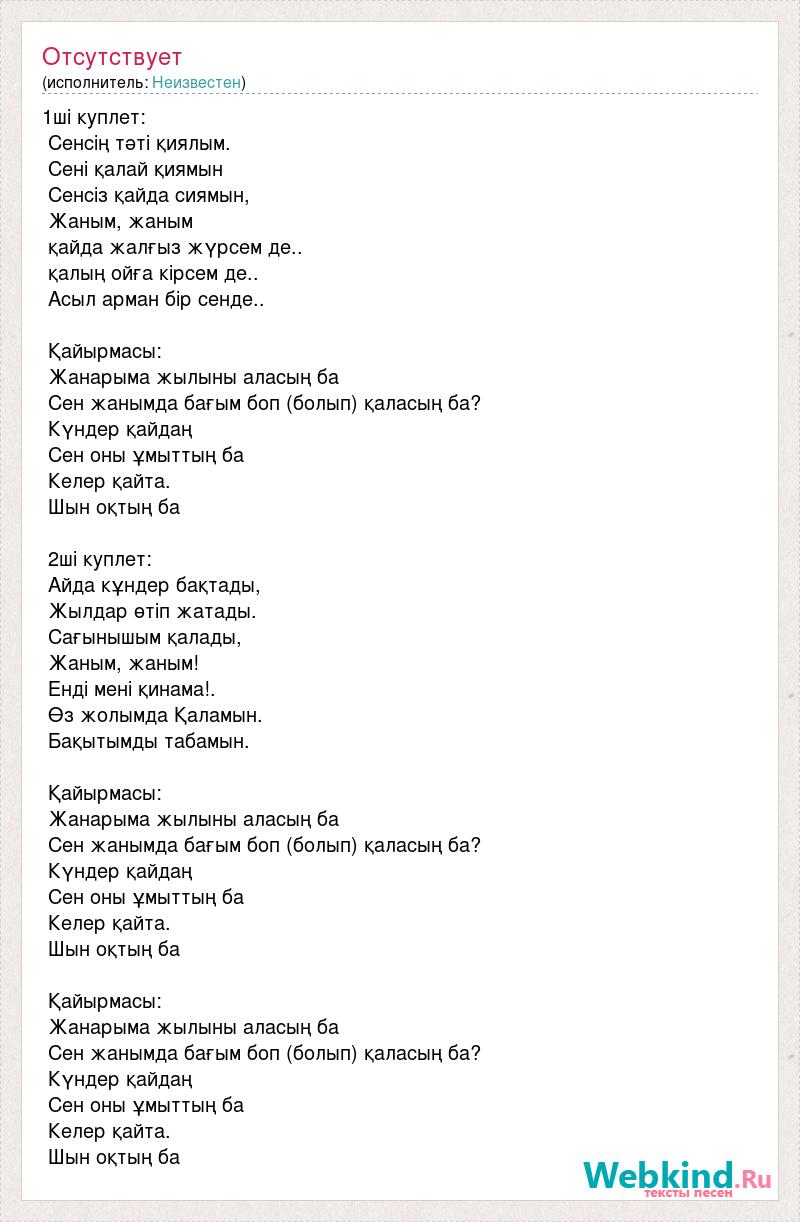 1ші куплет: Сенсің тәті қиялым. Сені қалай қиямын Сенсіз қайда сиямын, Жаным, жаным қайда жалғыз жүрсем де.. қалың ойға кірсем де.. Асыл арман бір сенде.. Қайырмасы: Жанарыма жылыны аласың ба Сен жанымда бағым боп (болып) қаласың ба? Күндер қайдаң Сен оны ұмыттың ба Келер қайта. Шын оқтың ба 2ші куплет: Айда кұндер бақтады, Жылдар өтіп жатады. Сағынышым қалады, Жаным, жаным! Енді мені қинама!. Өз жолымда Қаламын. Бақытымды табамын. Қайырмасы: Жанарыма жылыны аласың ба Сен жанымда бағым боп (болып) қаласың ба? Күндер қайдаң Сен оны ұмыттың ба Келер қайта. Шын оқтың ба Қайырмасы: Жанарыма жылыны аласың ба Сен жанымда бағым боп (болып) қаласың ба? Күндер қайдаң Сен оны ұмыттың ба Келер қайта. Шын оқтың ба