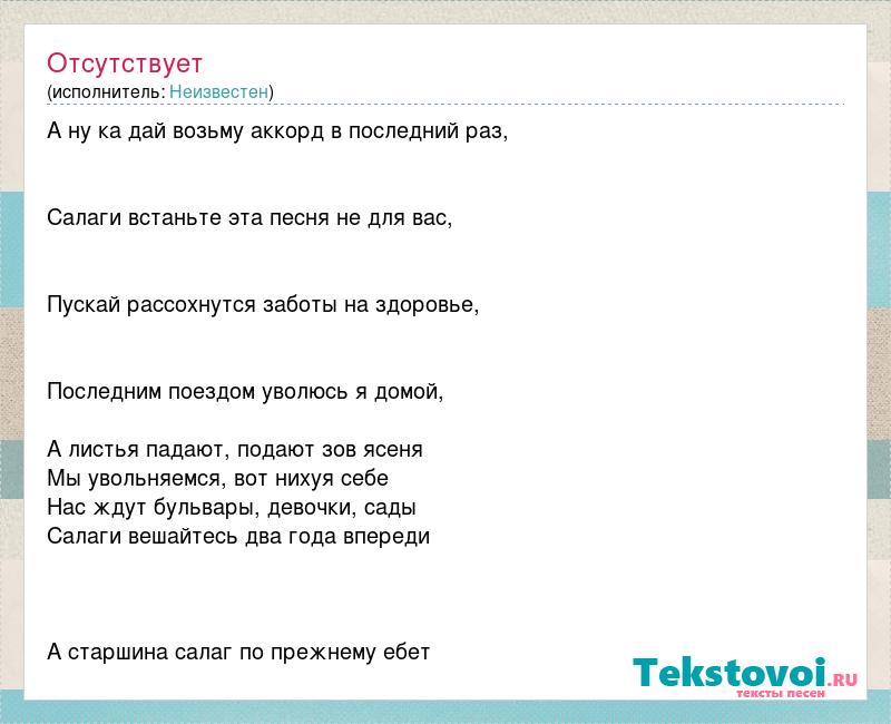 А ну ка дай возьму аккорд в последний раз, Салаги встаньте эта песня не для вас, Пускай рассохнутся заботы на здоровье, Последним поездом уволюсь я домой, А листья падают, подают зов ясеня Мы увольняемся, вот нихуя себе Нас ждут бульвары, девочки, сады Салаги вешайтесь два года впереди А старшина салаг по прежнему ебет