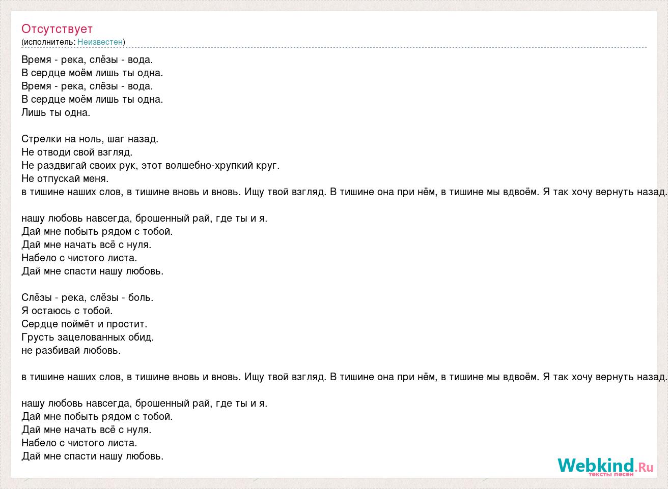 Время - река, слёзы - вода. В сердце моём лишь ты одна. Время - река, слёзы - вода. В сердце моём лишь ты одна. Лишь ты одна. Стрелки на ноль, шаг назад. Не отводи свой взгляд. Не раздвигай своих рук, этот волшебно-хрупкий круг. Не отпускай меня. в тишине наших слов, в тишине вновь и вновь. Ищу твой взгляд. В тишине она при нём, в тишине мы вдвоём. Я так хочу вернуть назад. нашу любовь навсегда, брошенный рай, где ты и я. Дай мне побыть рядом с тобой. Дай мне начать всё с нуля. Набело с чистого листа. Дай мне спасти нашу любовь. Слёзы - река, слёзы - боль. Я остаюсь с тобой. Сердце поймёт и простит. Грусть зацелованных обид. не разбивай любовь. в тишине наших слов, в тишине вновь и вновь. Ищу твой взгляд. В тишине она при нём, в тишине мы вдвоём. Я так хочу вернуть назад. нашу любовь навсегда, брошенный рай, где ты и я. Дай мне побыть рядом с тобой. Дай мне начать всё с нуля. Набело с чистого листа. Дай мне спасти нашу любовь.