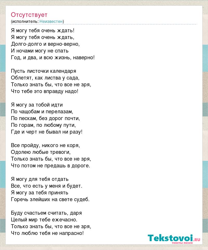 Я могу тебя очень ждать! Я могу тебя очень ждать, Долго-долго и верно-верно, И ночами могу не спать Год, и два, и всю жизнь, наверно! Пусть листочки календаря Облетят, как листва у сада, Только знать бы, что все не зря, Что тебе это вправду надо! Я могу за тобой идти По чащобам и перелазам, По пескам, без дорог почти, По горам, по любому пути, Где и черт не бывал ни разу! Все пройду, никого не коря, Одолею любые тревоги, Только знать бы, что все не зря, Что потом не предашь в дороге. Я могу для тебя отдать Все, что есть у меня и будет. Я могу за тебя принять Горечь злейших на свете судеб. Буду счастьем считать, даря Целый мир тебе ежечасно. Только знать бы, что все не зря, Что люблю тебя не напрасно!