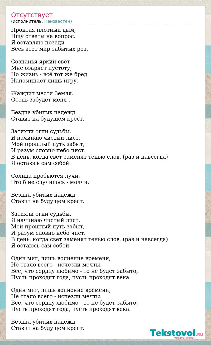 Пронзая плотный дым, Ищу ответы на вопрос. Я оставляю позади Весь этот мир забытых роз. Сознанья яркий свет Мне озаряет пустоту, Но жизнь - всё тот же бред Напоминает лишь игру. Жаждит мести Земля. Осень забудет меня . Бездна убитых надежд Ставит на будущем крест. Затихли огни судьбы. Я начинаю чистый лист. Мой прошлый путь забыт, И разум словно небо чист. В день, когда свет заменят тенью слов, (раз и навсегда) Я остаюсь сам собой. Солнца пробьются лучи. Что б не случилось - молчи. Бездна убитых надежд Ставит на будущем крест. Затихли огни судьбы. Я начинаю чистый лист. Мой прошлый путь забыт, И разум словно небо чист. В день, когда свет заменят тенью слов, (раз и навсегда) Я остаюсь сам собой. Один миг, лишь волнение времени, Не стало всего - исчезли мечты. Всё, что сердцу любимо - то не будет забыто, Пусть проходят года, пусть проходят века. Один миг, лишь волнение времени, Не стало всего - исчезли мечты. Всё, что сердцу любимо - то не будет забыто, Пусть проходят года, пусть проходят века. Бездна убитых надежд Ставит на будущем крест.
