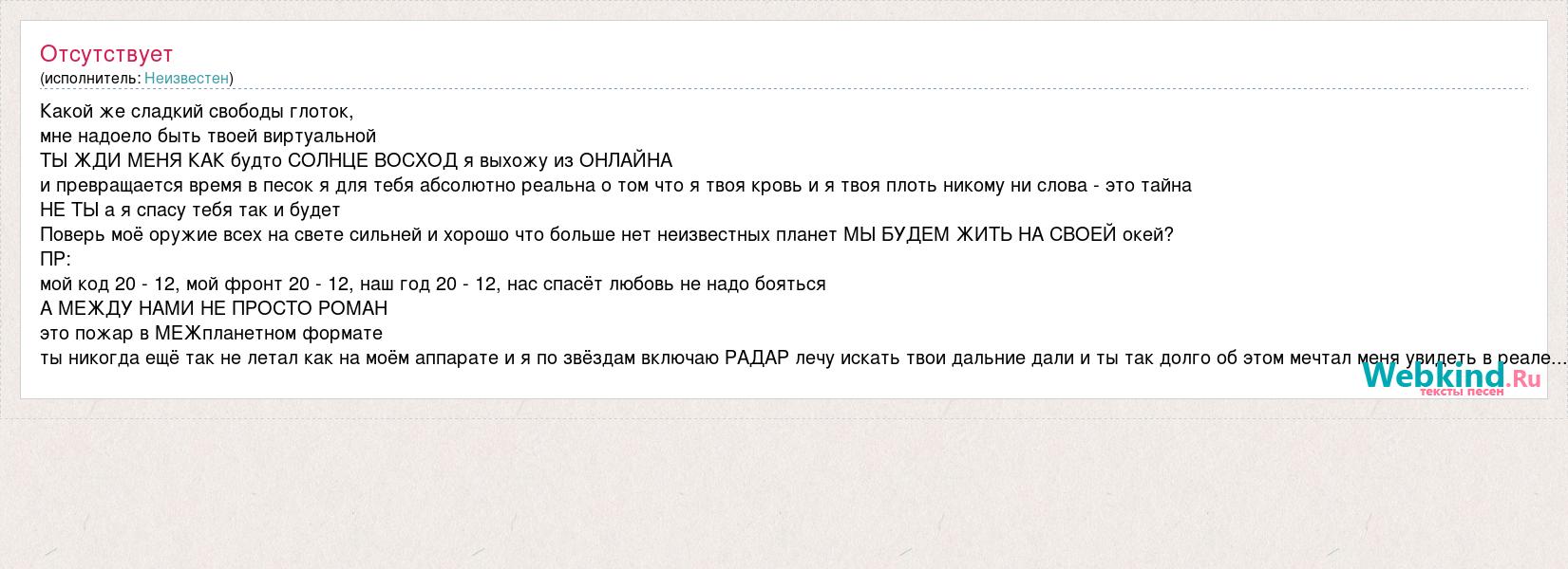 Какой же сладкий свободы глоток, мне надоело быть твоей виртуальной ТЫ ЖДИ МЕНЯ КАК будто СОЛНЦЕ ВОСХОД я выхожу из ОНЛАЙНА и превращается время в песок я для тебя абсолютно реальна о том что я твоя кровь и я твоя плоть никому ни слова - это тайна НЕ ТЫ а я спасу тебя так и будет Поверь моё оружие всех на свете сильней и хорошо что больше нет неизвестных планет МЫ БУДЕМ ЖИТЬ НА СВОЕЙ окей? ПР: мой код 20 - 12, мой фронт 20 - 12, наш год 20 - 12, нас спасёт любовь не надо бояться А МЕЖДУ НАМИ НЕ ПРОСТО РОМАН это пожар в МЕЖпланетном формате ты никогда ещё так не летал как на моём аппарате и я по звёздам включаю РАДАР лечу искать твои дальние дали и ты так долго об этом мечтал меня увидеть в реале...