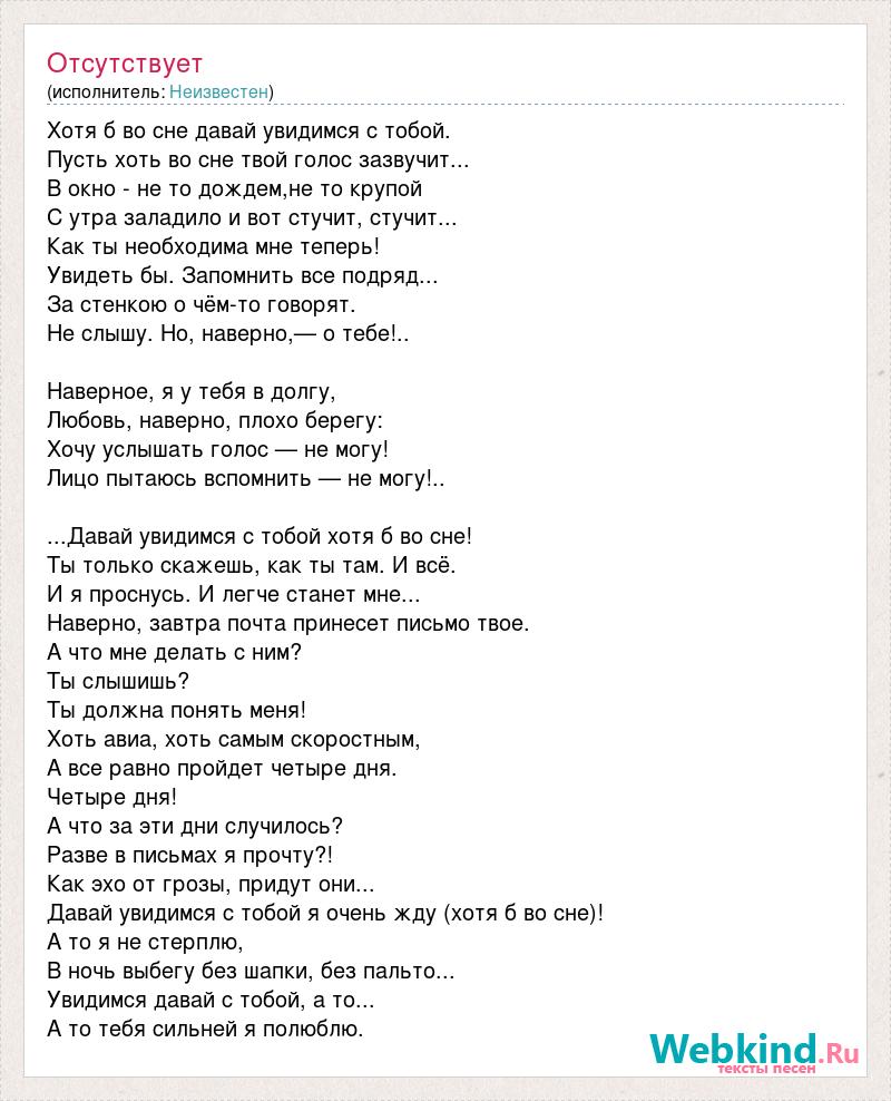 Хотя б во сне давай увидимся с тобой. Пусть хоть во сне твой голос зазвучит... В окно - не то дождем,не то крупой С утра заладило и вот стучит, стучит... Как ты необходима мне теперь! Увидеть бы. Запомнить все подряд... За стенкою о чём-то говорят. Не слышу. Но, наверно,— о тебе!.. Наверное, я у тебя в долгу, Любовь, наверно, плохо берегу: Хочу услышать голос — не могу! Лицо пытаюсь вспомнить — не могу!.. ...Давай увидимся с тобой хотя б во сне! Ты только скажешь, как ты там. И всё. И я проснусь. И легче станет мне... Наверно, завтра почта принесет письмо твое. А что мне делать с ним? Ты слышишь? Ты должна понять меня! Хоть авиа, хоть самым скоростным, А все равно пройдет четыре дня. Четыре дня! А что за эти дни случилось? Разве в письмах я прочту?! Как эхо от грозы, придут они... Давай увидимся с тобой я очень жду (хотя б во сне)! А то я не стерплю, В ночь выбегу без шапки, без пальто... Увидимся давай с тобой, а то... А то тебя сильней я полюблю.