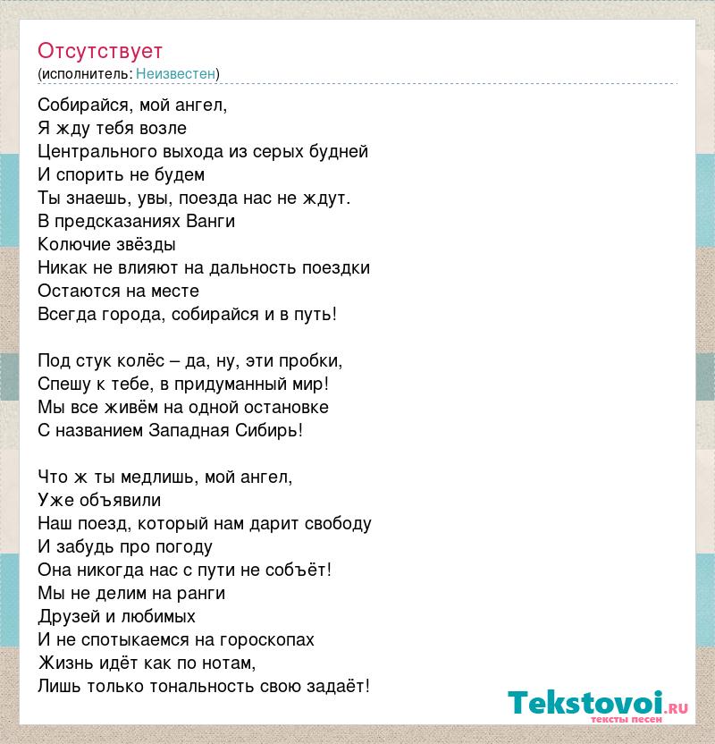 Собирайся, мой ангел, Я жду тебя возле Центрального выхода из серых будней И спорить не будем Ты знаешь, увы, поезда нас не ждут. В предсказаниях Ванги Колючие звёзды Никак не влияют на дальность поездки Остаются на месте Всегда города, собирайся и в путь! Под стук колёс – да, ну, эти пробки, Спешу к тебе, в придуманный мир! Мы все живём на одной остановке С названием Западная Сибирь! Что ж ты медлишь, мой ангел, Уже объявили Наш поезд, который нам дарит свободу И забудь про погоду Она никогда нас с пути не собъёт! Мы не делим на ранги Друзей и любимых И не спотыкаемся на гороскопах Жизнь идёт как по нотам, Лишь только тональность свою задаёт!