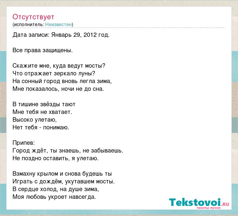Дата записи: Январь 29, 2012 год. Все права защищены. Скажите мне, куда ведут мосты? Что отражает зеркало луны? На сонный город вновь легла зима, Мне показалось, ночи не до сна. В тишине звёзды тают Мне тебя не хватает. Высоко улетаю, Нет тебя - понимаю. Припев: Город ждёт, ты знаешь, не забываешь. Не поздно оставить, я улетаю. Взмахну крылом и снова будешь ты Играть с дождём, укутавшем мосты. В сердце холод, на душе зима, Моя любовь укроет навсегда.