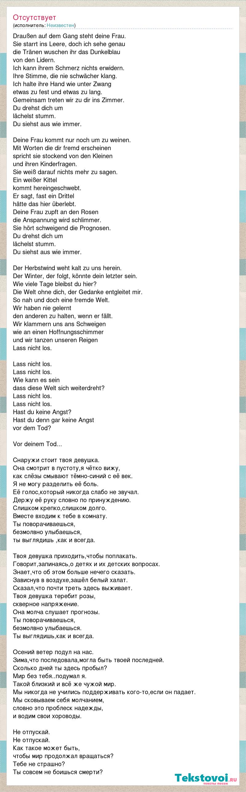 Draußen auf dem Gang steht deine Frau. Sie starrt ins Leere, doch ich sehe genau die Tränen wuschen ihr das Dunkelblau von den Lidern. Ich kann ihrem Schmerz nichts erwidern. Ihre Stimme, die nie schwächer klang. Ich halte ihre Hand wie unter Zwang etwas zu fest und etwas zu lang. Gemeinsam treten wir zu dir ins Zimmer. Du drehst dich um lächelst stumm. Du siehst aus wie immer. Deine Frau kommt nur noch um zu weinen. Mit Worten die dir fremd erscheinen spricht sie stockend von den Kleinen und ihren Kinderfragen. Sie weiß darauf nichts mehr zu sagen. Ein weißer Kittel kommt hereingeschwebt. Er sagt, fast ein Drittel hätte das hier überlebt. Deine Frau zupft an den Rosen die Anspannung wird schlimmer. Sie hört schweigend die Prognosen. Du drehst dich um lächelst stumm. Du siehst aus wie immer. Der Herbstwind weht kalt zu uns herein. Der Winter, der folgt, könnte dein letzter sein. Wie viele Tage bleibst du hier? Die Welt ohne dich, der Gedanke entgleitet mir. So nah und doch eine fremde Welt. Wir haben nie gelernt den anderen zu halten, wenn er fällt. Wir klammern uns ans Schweigen wie an einen Hoffnungsschimmer und wir tanzen unseren Reigen Lass nicht los. Lass nicht los. Lass nicht los. Wie kann es sein dass diese Welt sich weiterdreht? Lass nicht los. Lass nicht los. Hast du keine Angst? Hast du denn gar keine Angst vor dem Tod? Vor deinem Tod... Снаружи стоит твоя девушка. Она смотрит в пустоту,я чётко вижу, как слёзы смывают тёмно-синий с её век. Я не могу разделить её боль. Её голос,который никогда слабо не звучал. Держу её руку словно по принуждению. Слишком крепко,слишком долго. Вместе входим к тебе в комнату. Ты поворачиваешься, безмолвно улыбаешься, ты выглядишь ,как и всегда. Твоя девушка приходить,чтобы поплакать. Говорит,запинаясь,о детях и их детских вопросах. Знает,что об этом больше нечего сказать. Зависнув в воздухе,зашёл белый халат. Сказал,что почти треть здесь выживает. Твоя девушка теребит розы, скверное напряжение. Она молча слушает прогнозы. Ты поворачиваешься, безмолвно улыбаешься. Ты выглядишь,как и всегда. Осений ветер подул на нас. Зима,что последовала,могла быть твоей последней. Сколько дней ты здесь пробыл? Мир без тебя..подумал я. Такой близкий и всё же чужой мир. Мы никогда не учились поддерживать кого-то,если он падает. Мы сковываем себя молчанием, словно это проблеск надежды, и водим свои хороводы. Не отпускай. Не отпускай. Как такое может быть, чтобы мир продолжал вращаться? Тебе не страшно? Ты совсем не боишься смерти?