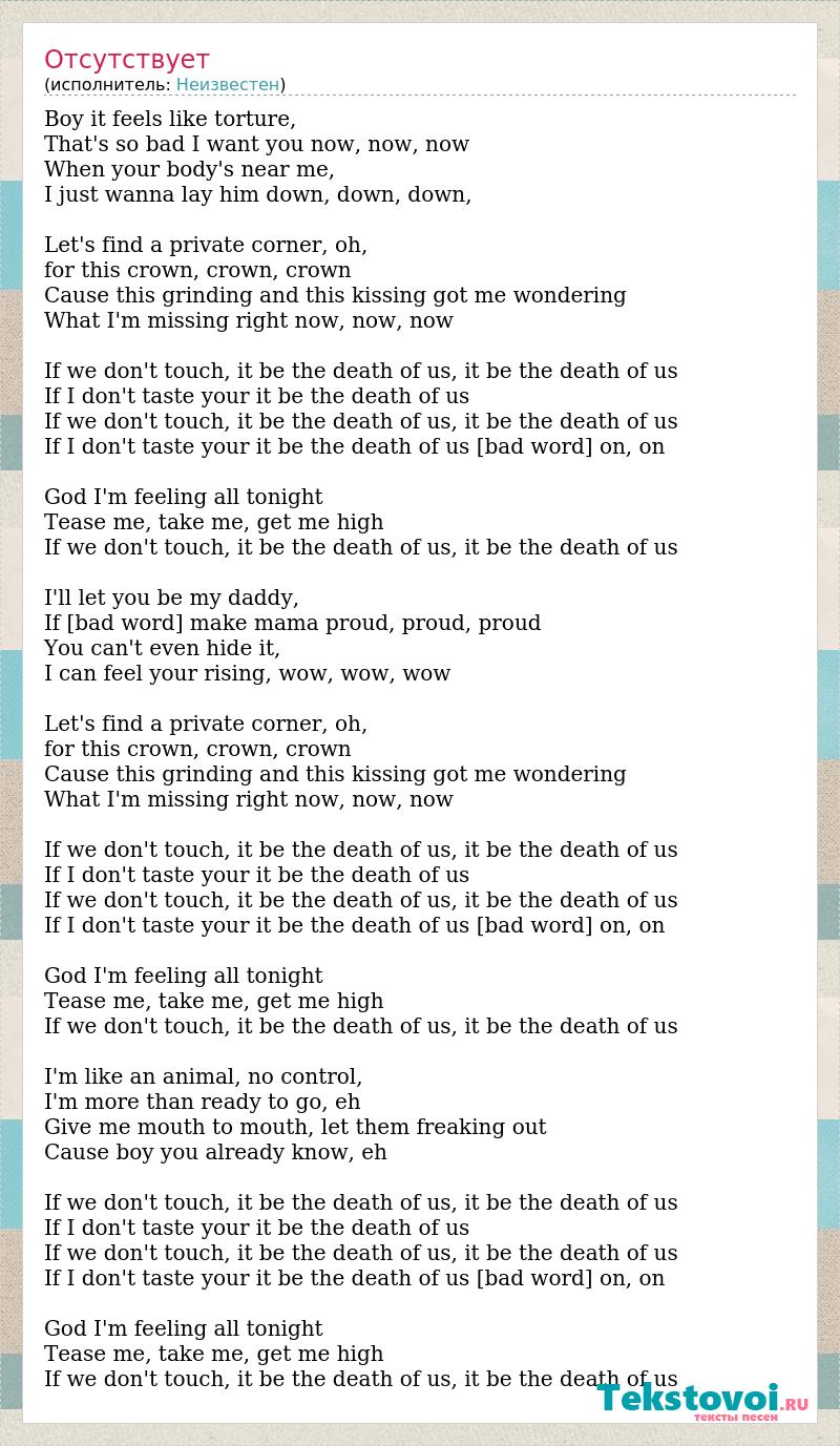 Boy it feels like torture, That's so bad I want you now, now, now When your body's near me, I just wanna lay him down, down, down, Let's find a private corner, oh, for this crown, crown, crown Cause this grinding and this kissing got me wondering What I'm missing right now, now, now If we don't touch, it be the death of us, it be the death of us If I don't taste your it be the death of us If we don't touch, it be the death of us, it be the death of us If I don't taste your it be the death of us [bad word] on, on God I'm feeling all tonight Tease me, take me, get me high If we don't touch, it be the death of us, it be the death of us I'll let you be my daddy, If [bad word] make mama proud, proud, proud You can't even hide it, I can feel your rising, wow, wow, wow Let's find a private corner, oh, for this crown, crown, crown Cause this grinding and this kissing got me wondering What I'm missing right now, now, now If we don't touch, it be the death of us, it be the death of us If I don't taste your it be the death of us If we don't touch, it be the death of us, it be the death of us If I don't taste your it be the death of us [bad word] on, on God I'm feeling all tonight Tease me, take me, get me high If we don't touch, it be the death of us, it be the death of us I'm like an animal, no control, I'm more than ready to go, eh Give me mouth to mouth, let them freaking out Cause boy you already know, eh If we don't touch, it be the death of us, it be the death of us If I don't taste your it be the death of us If we don't touch, it be the death of us, it be the death of us If I don't taste your it be the death of us [bad word] on, on God I'm feeling all tonight Tease me, take me, get me high If we don't touch, it be the death of us, it be the death of us
