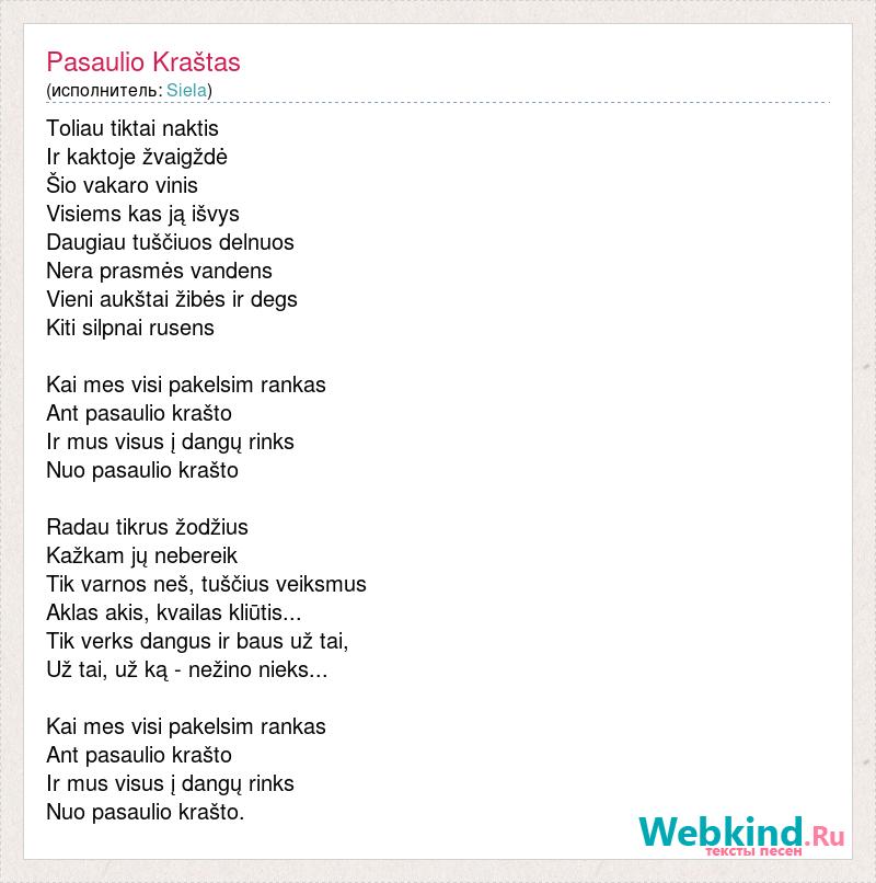 Toliau tiktai naktis Ir kaktoje žvaigždė Šio vakaro vinis Visiems kas ją išvys Daugiau tuščiuos delnuos Nera prasmės vandens Vieni aukštai žibės ir degs Kiti [bad word] Kai mes visi pakelsim rankas Ant pasaulio krašto Ir mus visus į dangų rinks Nuo pasaulio krašto Radau [bad word] žodžius Kažkam jų nebereik Tik varnos neš, tuščius veiksmus Aklas akis, kvailas kliūtis... Tik verks dangus ir baus už tai, Už tai, už ką - nežino nieks... Kai mes visi pakelsim rankas Ant pasaulio krašto Ir mus visus į dangų rinks Nuo pasaulio krašto.
