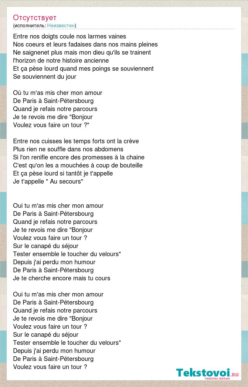 Entre nos doigts coule nos larmes vaines Nos coeurs et leurs fadaises dans nos mains pleines Ne saignenet plus mais mon dieu qu'ils se trainent l'horizon de notre histoire ancienne Et ça pèse lourd quand mes poings se souviennent Se souviennent du jour Où tu m'as mis cher mon amour De Paris à Saint-Pétersbourg Quand je refais notre parcours Je te revois me dire "Bonjour Voulez vous faire un tour ?" Entre nos cuisses les temps forts ont la crève Plus rien ne souffle dans nos abdomens Si l'on renifle encore des promesses à la chaine C'est qu'on les a mouchées à coup de bouteille Et ça pèse lourd si tantôt je t'appelle Je t'appelle " Au secours" Oui tu m'as mis cher mon amour De Paris à Saint-Pétersbourg Quand je refais notre parcours Je te revois me dire "Bonjour Voulez vous faire un tour ? Sur le canapé du séjour Tester ensemble le toucher du velours" Depuis j'ai perdu mon humour De Paris à Saint-Pétersbourg Je te cherche encore mais tu cours Oui tu m'as mis cher mon amour De Paris à Saint-Pétersbourg Quand je refais notre parcours Je te revois me dire "Bonjour Voulez vous faire un tour ? Sur le canapé du séjour Tester ensemble le toucher du velours" Depuis j'ai perdu mon humour De Paris à Saint-Pétersbourg Voulez vous faire un tour ?