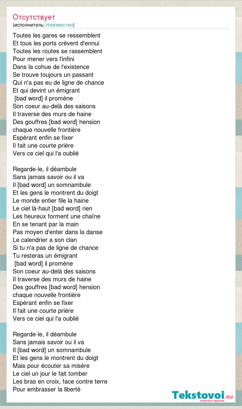 Toutes les gares se ressemblent Et tous les ports crèvent d'ennui Toutes les routes se rassemblent Pour mener vers l'infini Dans la cohue de l'existence Se trouve toujours un passant Qui n'a pas eu de ligne de chance Et qui devint un émigrant [bad word] il promène Son coeur au-delà des saisons Il traverse des murs de haine Des gouffres [bad word] hension chaque nouvelle frontière Espérant enfin se fixer Il fait une courte prière Vers ce ciel qui l'a oublié Regarde-le, il déambule Sans jamais savoir ou il va Il [bad word] un somnambule Et les gens le montrent du doigt Le monde entier file la haine Le ciel là-haut [bad word] rien Les heureux forment une chaîne En se tenant par la main Pas moyen d'enter dans la danse Le calendrier a son clan Si tu n'a pas de ligne de chance Tu resteras un émigrant [bad word] il promène Son coeur au-delà des saisons Il traverse des murs de haine Des gouffres [bad word] hension chaque nouvelle frontière Espérant enfin se fixer Il fait une courte prière Vers ce ciel qui l'a oublié Regarde-le, il déambule Sans jamais savoir ou il va Il [bad word] un somnambule Et les gens le montrent du doigt Mais pour écouter sa misère Le ciel un jour le fait tomber Les bras en croix, face contre terre Pour embrasser la liberté