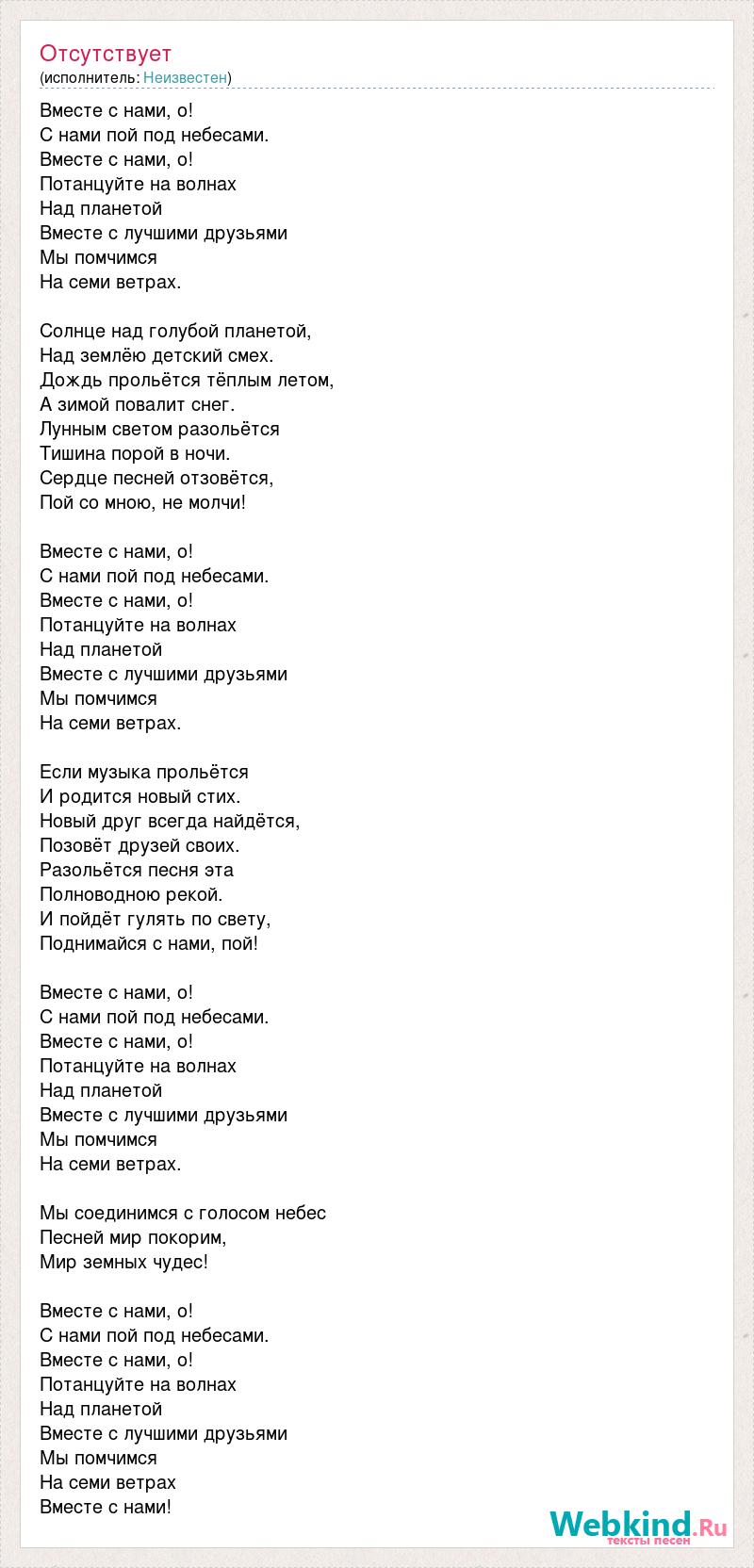 Вместе с нами, о! С нами пой под небесами. Вместе с нами, о! Потанцуйте на волнах Над планетой Вместе с лучшими друзьями Мы помчимся На семи ветрах. Солнце над голубой планетой, Над землёю детский смех. Дождь прольётся тёплым летом, А зимой повалит снег. Лунным светом разольётся Тишина порой в ночи. Сердце песней отзовётся, Пой со мною, не молчи! Вместе с нами, о! С нами пой под небесами. Вместе с нами, о! Потанцуйте на волнах Над планетой Вместе с лучшими друзьями Мы помчимся На семи ветрах. Если музыка прольётся И родится новый стих. Новый друг всегда найдётся, Позовёт друзей своих. Разольётся песня эта Полноводною рекой. И пойдёт гулять по свету, Поднимайся с нами, пой! Вместе с нами, о! С нами пой под небесами. Вместе с нами, о! Потанцуйте на волнах Над планетой Вместе с лучшими друзьями Мы помчимся На семи ветрах. Мы соединимся с голосом небес Песней мир покорим, Мир земных чудес! Вместе с нами, о! С нами пой под небесами. Вместе с нами, о! Потанцуйте на волнах Над планетой Вместе с лучшими друзьями Мы помчимся На семи ветрах Вместе с нами!