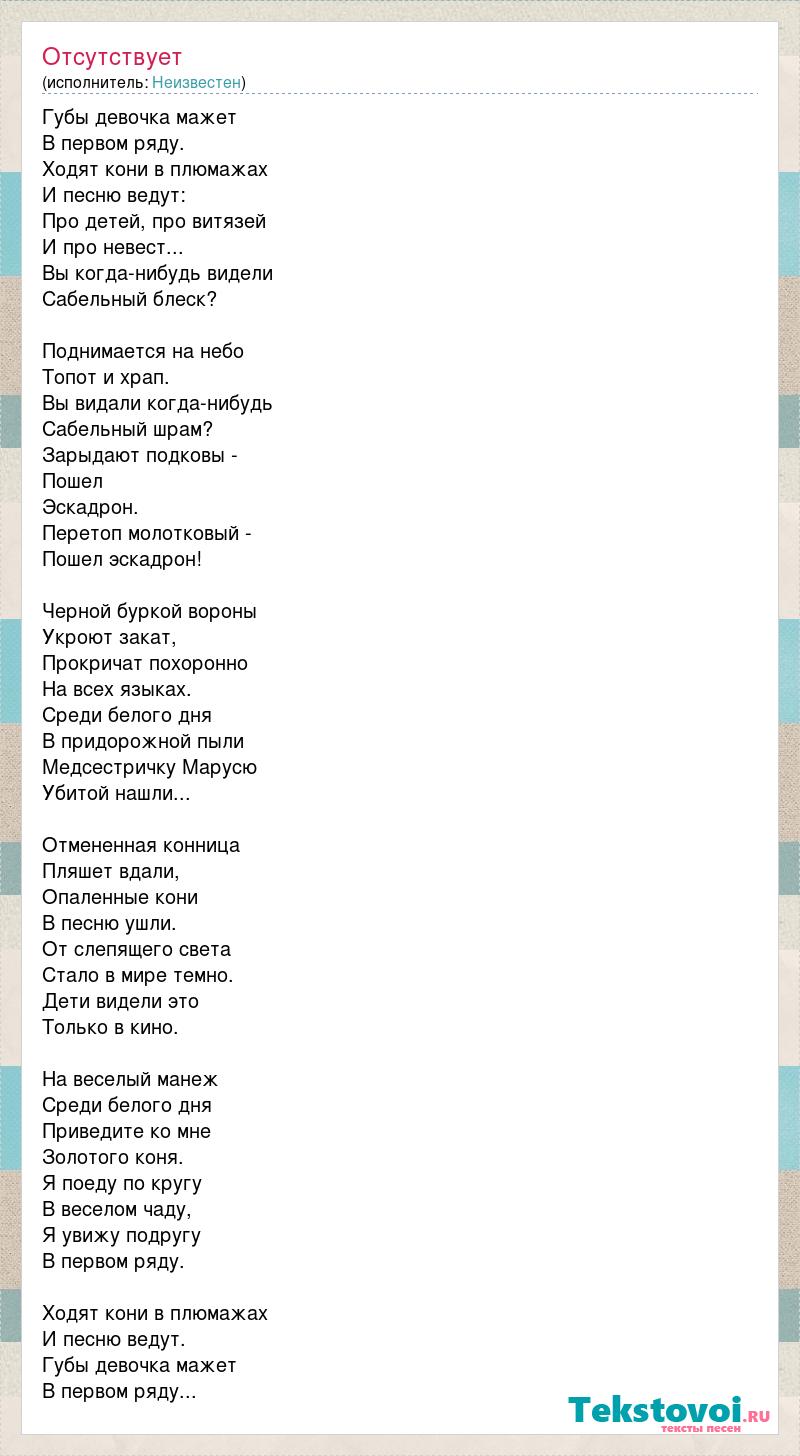 Губы девочка мажет В первом ряду. Ходят кони в плюмажах И песню ведут: Про детей, про витязей И про невест... Вы когда-нибудь видели Сабельный блеск? Поднимается на небо Топот и храп. Вы видали когда-нибудь Сабельный шрам? Зарыдают подковы - Пошел Эскадрон. Перетоп молотковый - Пошел эскадрон! Черной буркой вороны Укроют закат, Прокричат похоронно На всех языках. Среди белого дня В придорожной пыли Медсестричку Марусю Убитой нашли... Отмененная конница Пляшет вдали, Опаленные кони В песню ушли. От слепящего света Стало в мире темно. Дети видели это Только в кино. На веселый манеж Среди белого дня Приведите ко мне Золотого коня. Я поеду по кругу В веселом чаду, Я увижу подругу В первом ряду. Ходят кони в плюмажах И песню ведут. Губы девочка мажет В первом ряду...