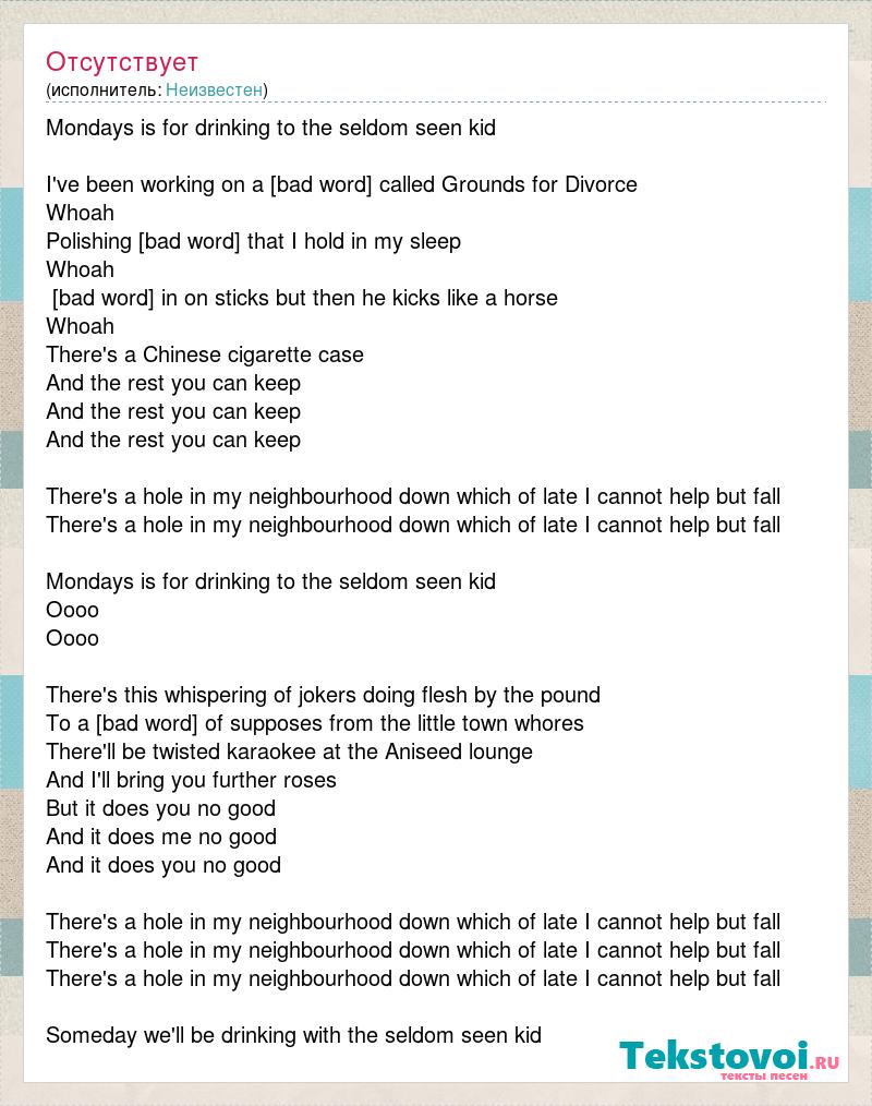 Mondays is for drinking to the seldom seen kid I've been working on a [bad word] called Grounds for Divorce Whoah Polishing [bad word] that I hold in my sleep Whoah [bad word] in on sticks but then he kicks like a horse Whoah There's a Chinese cigarette case And the rest you can keep And the rest you can keep And the rest you can keep There's a hole in my neighbourhood down which of late I cannot help but fall There's a hole in my neighbourhood down which of late I cannot help but fall Mondays is for drinking to the seldom seen kid Oooo Oooo There's this whispering of jokers doing flesh by the pound To a [bad word] of supposes from the little town whores There'll be twisted karaokee at the Aniseed lounge And I'll bring you further roses But it does you no good And it does me no good And it does you no good There's a hole in my neighbourhood down which of late I cannot help but fall There's a hole in my neighbourhood down which of late I cannot help but fall There's a hole in my neighbourhood down which of late I cannot help but fall Someday we'll be drinking with the seldom seen kid