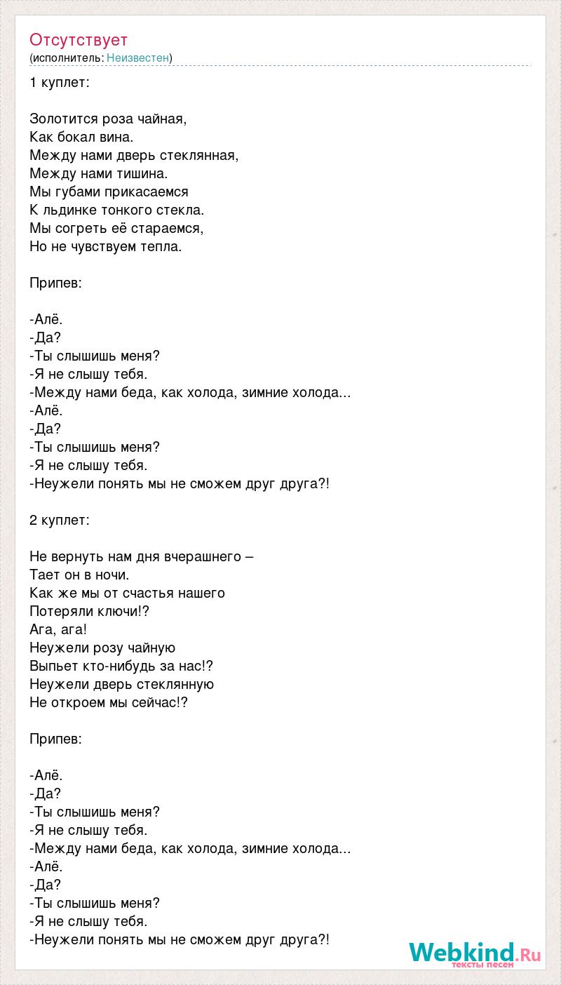 1 куплет: Золотится роза чайная, Как бокал вина. Между нами дверь стеклянная, Между нами тишина. Мы губами прикасаемся К льдинке тонкого стекла. Мы согреть её стараемся, Но не чувствуем тепла. Припев: -Алё. -Да? -Ты слышишь меня? -Я не слышу тебя. -Между нами беда, как холода, зимние холода... -Алё. -Да? -Ты слышишь меня? -Я не слышу тебя. -Неужели понять мы не сможем друг друга?! 2 куплет: Не вернуть нам дня вчерашнего – Тает он в ночи. Как же мы от счастья нашего Потеряли ключи!? Ага, ага! Неужели розу чайную Выпьет кто-нибудь за нас!? Неужели дверь стеклянную Не откроем мы сейчас!? Припев: -Алё. -Да? -Ты слышишь меня? -Я не слышу тебя. -Между нами беда, как холода, зимние холода... -Алё. -Да? -Ты слышишь меня? -Я не слышу тебя. -Неужели понять мы не сможем друг друга?!
