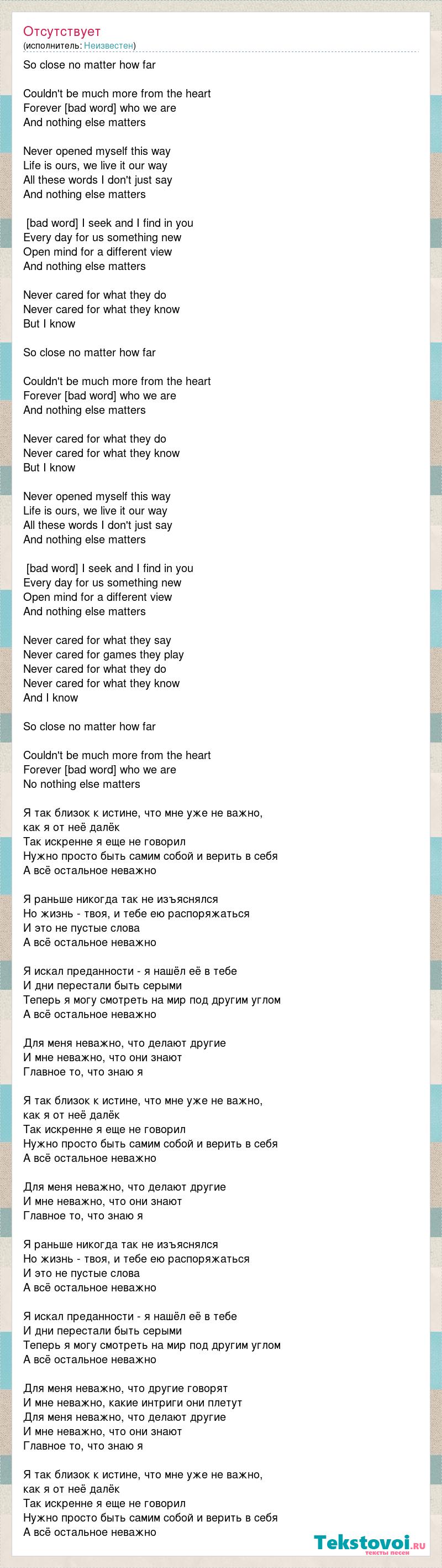 So close no matter how far Couldn't be much more from the heart Forever [bad word] who we are And nothing else matters Never opened myself this way Life is ours, we live it our way All these words I don't just say And nothing else matters [bad word] I seek and I find in you Every day for us something new Open mind for a different view And nothing else matters Never cared for what they do Never cared for what they know But I know So close no matter how far Couldn't be much more from the heart Forever [bad word] who we are And nothing else matters Never cared for what they do Never cared for what they know But I know Never opened myself this way Life is ours, we live it our way All these words I don't just say And nothing else matters [bad word] I seek and I find in you Every day for us something new Open mind for a different view And nothing else matters Never cared for what they say Never cared for games they play Never cared for what they do Never cared for what they know And I know So close no matter how far Couldn't be much more from the heart Forever [bad word] who we are No nothing else matters Я так близок к истине, что мне уже не важно, как я от неё далёк Так искренне я еще не говорил Нужно просто быть самим собой и верить в себя А всё остальное неважно Я раньше никогда так не изъяснялся Но жизнь - твоя, и тебе ею распоряжаться И это не пустые слова А всё остальное неважно Я искал преданности - я нашёл её в тебе И дни перестали быть серыми Теперь я могу смотреть на мир под другим углом А всё остальное неважно Для меня неважно, что делают другие И мне неважно, что они знают Главное то, что знаю я Я так близок к истине, что мне уже не важно, как я от неё далёк Так искренне я еще не говорил Нужно просто быть самим собой и верить в себя А всё остальное неважно Для меня неважно, что делают другие И мне неважно, что они знают Главное то, что знаю я Я раньше никогда так не изъяснялся Но жизнь - твоя, и тебе ею распоряжаться И это не пустые слова А всё остальное неважно Я искал преданности - я нашёл её в тебе И дни перестали быть серыми Теперь я могу смотреть на мир под другим углом А всё остальное неважно Для меня неважно, что другие говорят И мне неважно, какие интриги они плетут Для меня неважно, что делают другие И мне неважно, что они знают Главное то, что знаю я Я так близок к истине, что мне уже не важно, как я от неё далёк Так искренне я еще не говорил Нужно просто быть самим собой и верить в себя А всё остальное неважно