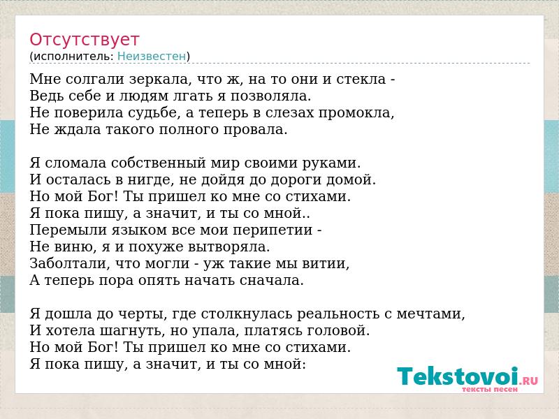 Мне солгали зеркала, что ж, на то они и стекла - Ведь себе и людям лгать я позволяла. Не поверила судьбе, а теперь в слезах промокла, Не ждала такого полного провала. Я сломала собственный мир своими руками. И осталась в нигде, не дойдя до дороги домой. Но мой Бог! Ты пришел ко мне со стихами. Я пока пишу, а значит, и ты со мной.. Перемыли языком все мои перипетии - Не виню, я и похуже вытворяла. Заболтали, что могли - уж такие мы витии, А теперь пора опять начать сначала. Я дошла до черты, где столкнулась реальность с мечтами, И хотела шагнуть, но упала, платясь головой. Но мой Бог! Ты пришел ко мне со стихами. Я пока пишу, а значит, и ты со мной:
