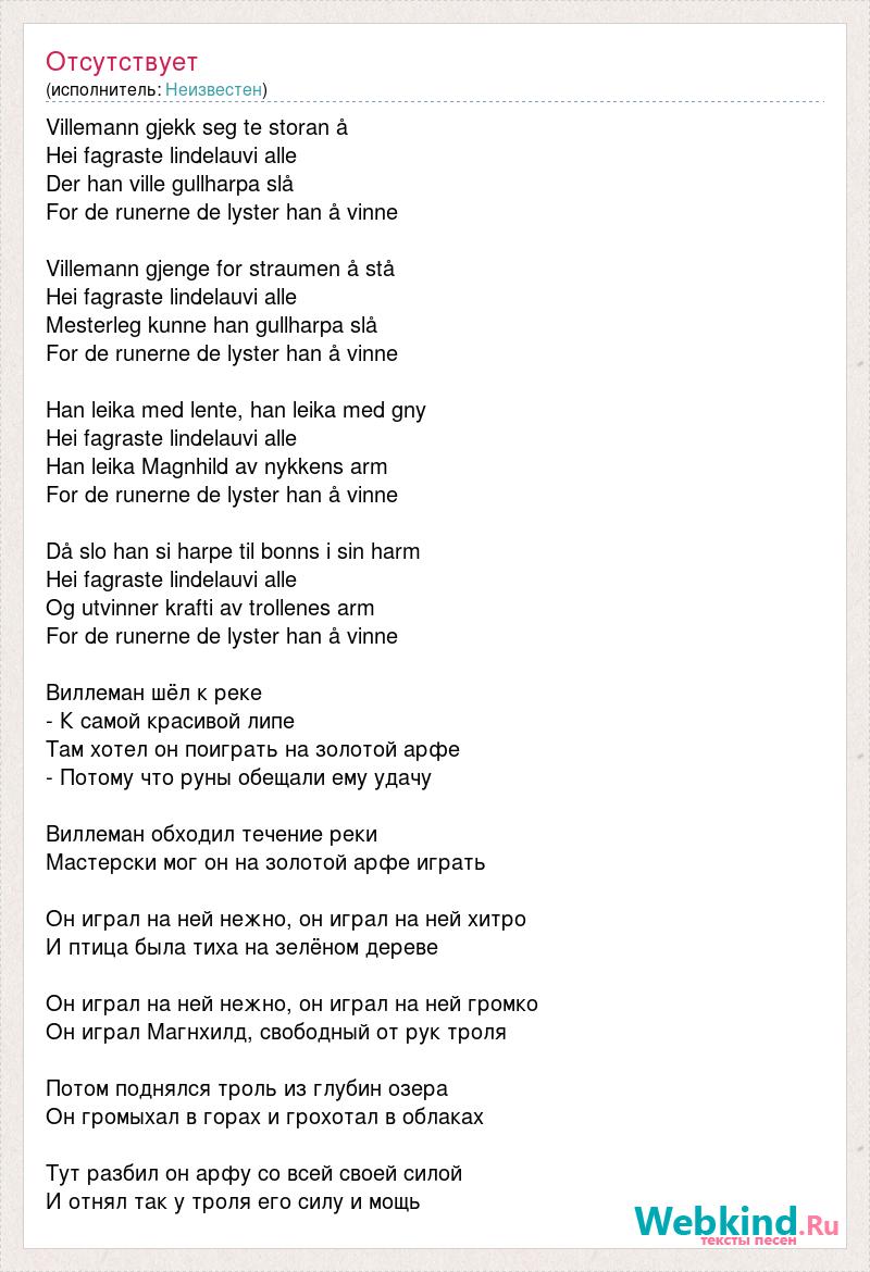 Villemann gjekk seg te storan å Hei [bad word] lindelauvi alle Der han ville gullharpa slå For [bad word] de lyster han å vinne Villemann gjenge for straumen å stå Hei [bad word] lindelauvi alle Mesterleg kunne han gullharpa slå For [bad word] de lyster han å vinne Han leika med lente, han leika med gny Hei [bad word] lindelauvi alle Han leika Magnhild av nykkens arm For [bad word] de lyster han å vinne Då slo han si harpe til bonns i sin harm Hei [bad word] lindelauvi alle Og utvinner krafti av trollenes arm For [bad word] de lyster han å vinne Виллеман шёл к реке - К самой красивой липе Там хотел он поиграть на золотой арфе - Потому что руны обещали ему удачу Виллеман обходил течение реки Мастерски мог он на золотой арфе играть Он играл на ней нежно, он играл на ней хитро И птица была тиха на зелёном дереве Он играл на ней нежно, он играл на ней громко Он играл Магнхилд, свободный от рук троля Потом поднялся троль из глубин озера Он громыхал в горах и грохотал в облаках Тут разбил он арфу со всей своей силой И отнял так у троля его силу и мощь