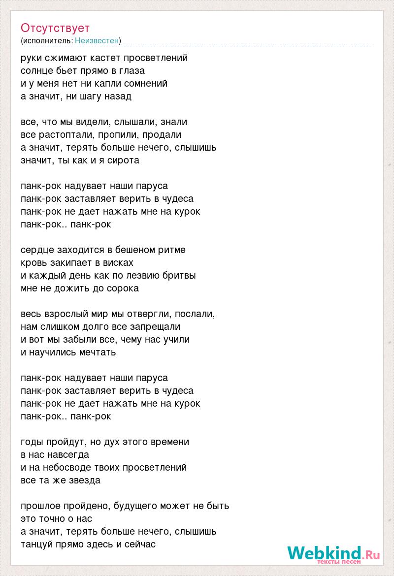 руки сжимают кастет просветлений солнце бьет прямо в глаза и у меня нет ни капли сомнений а значит, ни шагу назад все, что мы видели, слышали, знали все растоптали, пропили, продали а значит, терять больше нечего, слышишь значит, ты как и я сирота панк-рок надувает наши паруса панк-рок заставляет верить в чудеса панк-рок не дает нажать мне на курок панк-рок.. панк-рок сердце заходится в бешеном ритме кровь закипает в висках и каждый день как по лезвию бритвы мне не дожить до сорока весь взрослый мир мы отвергли, послали, нам слишком долго все запрещали и вот мы забыли все, чему нас учили и научились мечтать панк-рок надувает наши паруса панк-рок заставляет верить в чудеса панк-рок не дает нажать мне на курок панк-рок.. панк-рок годы пройдут, но дух этого времени в нас навсегда и на небосводе твоих просветлений все та же звезда прошлое пройдено, будущего может не быть это точно о нас а значит, терять больше нечего, слышишь танцуй прямо здесь и сейчас