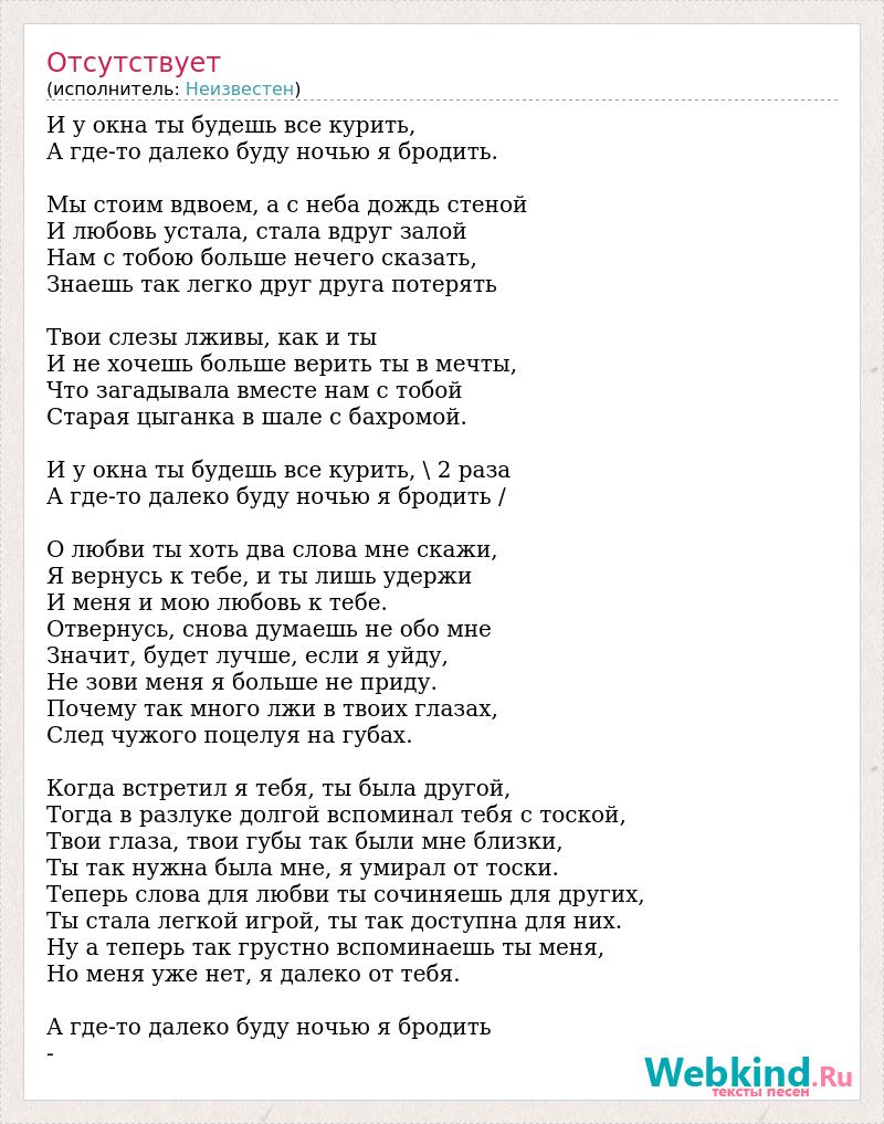 И у окна ты будешь все курить, А где-то далеко буду ночью я бродить. Мы стоим вдвоем, а с неба дождь стеной И любовь устала, стала вдруг залой Нам с тобою больше нечего сказать, Знаешь так легко друг друга потерять Твои слезы лживы, как и ты И не хочешь больше верить ты в мечты, Что загадывала вместе нам с тобой Старая цыганка в шале с бахромой. И у окна ты будешь все курить, \ 2 раза А где-то далеко буду ночью я бродить / О любви ты хоть два слова мне скажи, Я вернусь к тебе, и ты лишь удержи И меня и мою любовь к тебе. Отвернусь, снова думаешь не обо мне Значит, будет лучше, если я уйду, Не зови меня я больше не приду. Почему так много лжи в твоих глазах, След чужого поцелуя на губах. Когда встретил я тебя, ты была другой, Тогда в разлуке долгой вспоминал тебя с тоской, Твои глаза, твои губы так были мне близки, Ты так нужна была мне, я умирал от тоски. Теперь слова для любви ты сочиняешь для других, Ты стала легкой игрой, ты так доступна для них. Ну а теперь так грустно вспоминаешь ты меня, Но меня уже нет, я далеко от тебя. А где-то далеко буду ночью я бродить -
