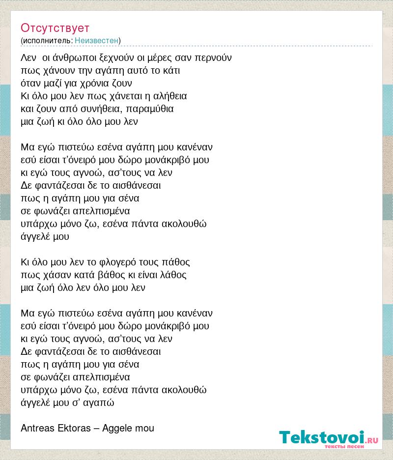 Λεν οι άνθρωποι ξεχνούν οι μέρες σαν περνούν πως χάνουν την αγάπη αυτό το κάτι όταν μαζί για χρόνια ζουν Κι όλο μου λεν πως χάνεται η αλήθεια και ζουν από συνήθεια, παραμύθια μια ζωή κι όλο όλο μου λεν Μα εγώ πιστεύω εσένα αγάπη μου κανέναν εσύ είσαι τ’όνειρό μου δώρο μονάκριβό μου κι εγώ τους αγνοώ, ασ’τους να λεν Δε φαντάζεσαι δε το αισθάνεσαι πως η αγάπη μου για σένα σε φωνάζει απελπισμένα υπάρχω μόνο ζω, εσένα πάντα ακολουθώ άγγελέ μου Κι όλο μου λεν το φλογερό τους πάθος πως χάσαν κατά βάθος κι είναι λάθος μια ζωή όλο λεν όλο μου λεν Μα εγώ πιστεύω εσένα αγάπη μου κανέναν εσύ είσαι τ’όνειρό μου δώρο μονάκριβό μου κι εγώ τους αγνοώ, ασ’τους να λεν Δε φαντάζεσαι δε το αισθάνεσαι πως η αγάπη μου για σένα σε φωνάζει απελπισμένα υπάρχω μόνο ζω, εσένα πάντα ακολουθώ άγγελέ μου σ’ αγαπώ Antreas Ektoras – Aggele mou