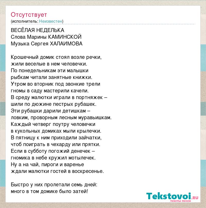 ВЕСЁЛАЯ НЕДЕЛЬКА Слова Марины КАМИНСКОЙ Музыка Сергея ХАЛАИМОВА Крошечный домик стоял возле речки, жили веселые в нем человечки. По понедельникам эти малышки рыбкам читали занятные книжки. Утром во вторник под звонкие трели гномы в саду мастерили качели. В среду малютки играли в портняжек – шили по дюжине пестрых рубашек. Эти рубашки дарили детишкам – ловким, проворным лесным муравьишкам. Каждый четверг поутру человечки в кукольных домиках мыли крылечки. В пятницу к ним приходили зайчатки, чтоб поиграть в чехарду или прятки. Если в субботу погожий денечек – гномика в небе кружил мотылечек. Ну а на чай, пироги и варенье ждали малютки гостей в воскресенье. Быстро у них пролетали семь дней: много в том домике было затей!