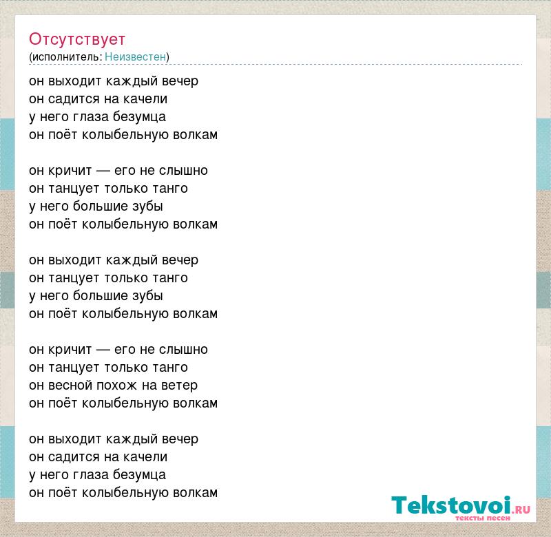 он выходит каждый вечер он садится на качели у него глаза безумца он поёт колыбельную волкам он кричит — его не слышно он танцует только танго у него большие зубы он поёт колыбельную волкам он выходит каждый вечер он танцует только танго у него большие зубы он поёт колыбельную волкам он кричит — его не слышно он танцует только танго он весной похож на ветер он поёт колыбельную волкам он выходит каждый вечер он садится на качели у него глаза безумца он поёт колыбельную волкам