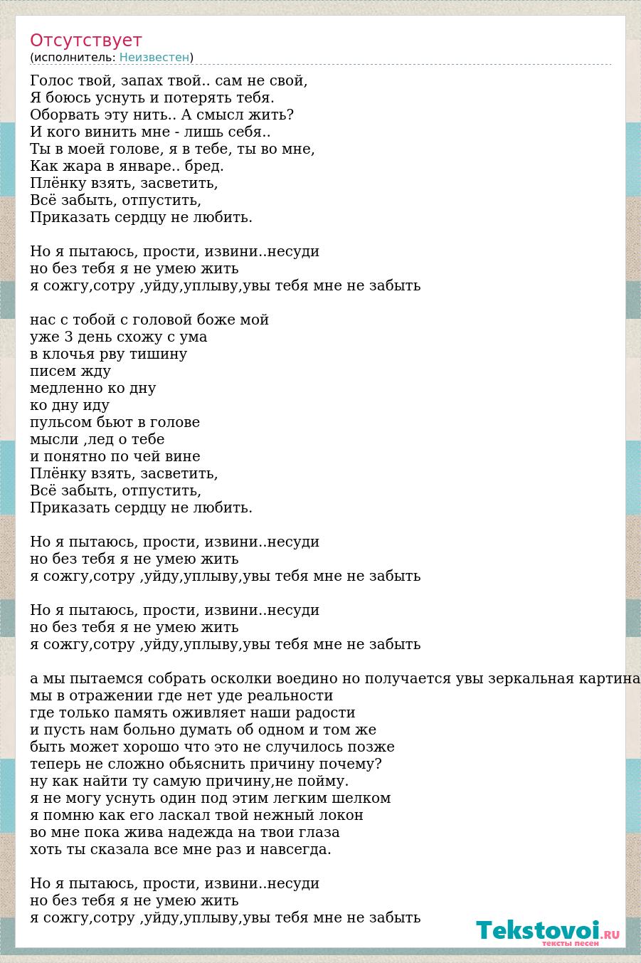 Голос твой, запах твой.. сам не свой, Я боюсь уснуть и потерять тебя. Оборвать эту нить.. А смысл жить? И кого винить мне - лишь себя.. Ты в моей голове, я в тебе, ты во мне, Как жара в январе.. бред. Плёнку взять, засветить, Всё забыть, отпустить, Приказать сердцу не любить. Но я пытаюсь, прости, извини..несуди но без тебя я не умею жить я сожгу,сотру ,уйду,уплыву,увы тебя мне не забыть нас с тобой с головой боже мой уже 3 день схожу с ума в клочья рву тишину писем жду медленно ко дну ко дну иду пульсом бьют в голове мысли ,лед о тебе и понятно по чей вине Плёнку взять, засветить, Всё забыть, отпустить, Приказать сердцу не любить. Но я пытаюсь, прости, извини..несуди но без тебя я не умею жить я сожгу,сотру ,уйду,уплыву,увы тебя мне не забыть Но я пытаюсь, прости, извини..несуди но без тебя я не умею жить я сожгу,сотру ,уйду,уплыву,увы тебя мне не забыть а мы пытаемся собрать осколки воедино но получается увы зеркальная картина мы в отражении где нет уде реальности где только память оживляет наши радости и пусть нам больно думать об одном и том же быть может хорошо что это не случилось позже теперь не сложно обьяснить причину почему? ну как найти ту самую причину,не пойму. я не могу уснуть один под этим легким шелком я помню как его ласкал твой нежный локон во мне пока жива надежда на твои глаза хоть ты сказала все мне раз и навсегда. Но я пытаюсь, прости, извини..несуди но без тебя я не умею жить я сожгу,сотру ,уйду,уплыву,увы тебя мне не забыть