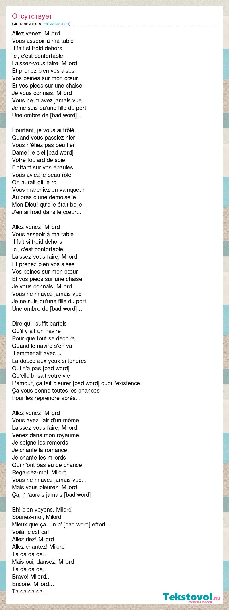 Allez venez! Milord Vous asseoir à ma table Il fait si froid dehors Ici, c'est confortable Laissez-vous faire, Milord Et prenez bien vos aises Vos peines sur mon cœur Et vos pieds sur une chaise Je vous connais, Milord Vous ne m'avez jamais vue Je ne suis qu'une fille du port Une ombre de [bad word] .. Pourtant, je vous ai frôlé Quand vous passiez hier Vous n'étiez pas peu fier Dame! le ciel [bad word] Votre foulard de soie Flottant sur vos épaules Vous aviez le beau rôle On aurait dit le roi Vous marchiez en vainqueur Au bras d'une demoiselle Mon Dieu! qu'elle était belle J'en ai froid dans le cœur... Allez venez! Milord Vous asseoir à ma table Il fait si froid dehors Ici, c'est confortable Laissez-vous faire, Milord Et prenez bien vos aises Vos peines sur mon cœur Et vos pieds sur une chaise Je vous connais, Milord Vous ne m'avez jamais vue Je ne suis qu'une fille du port Une ombre de [bad word] .. Dire qu'il suffit parfois Qu'il y ait un navire Pour que tout se déchire Quand le navire s'en va Il emmenait avec lui La douce aux yeux si tendres Qui n'a pas [bad word] Qu'elle brisait votre vie L'amour, ça fait pleurer [bad word] quoi l'existence Ça vous donne toutes les chances Pour les reprendre après... Allez venez! Milord Vous avez l'air d'un môme Laissez-vous faire, Milord Venez dans mon royaume Je soigne les remords Je chante la romance Je chante les milords Qui n'ont pas eu de chance Regardez-moi, Milord Vous ne m'avez jamais vue... Mais vous pleurez, Milord Ça, j' l'aurais jamais [bad word] Eh! bien voyons, Milord Souriez-moi, Milord Mieux que ça, un p' [bad word] effort... Voilà, c'est ça! Allez riez! Milord Allez chantez! Milord Ta da da da... Mais oui, dansez, Milord Ta da da da... Bravo! Milord... Encore, Milord... Ta da da da...