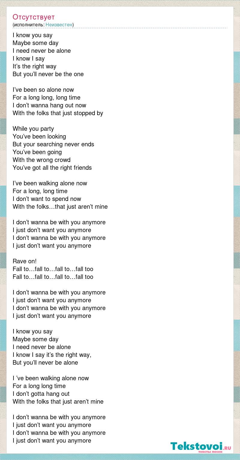I know you say Maybe some day I need never be alone I know I say It’s the right way But you’ll never be the one I’ve been so alone now For a long long, long time I don’t wanna hang out now With the folks that just stopped by While you party You’ve been looking But your searching never ends You’ve been going With the wrong crowd You’ve got all the right friends I’ve been walking alone now For a long, long time I don’t want to spend now With the folks…that just aren’t mine I don’t wanna be with you anymore I just don’t want you anymore I don’t wanna be with you anymore I just don’t want you anymore Rave on! Fall to…fall to…fall to…fall too Fall to…fall to…fall to…fall too I don’t wanna be with you anymore I just don’t want you anymore I don’t wanna be with you anymore I just don’t want you anymore I know you say Maybe some day I need never be alone I know I say it’s the right way, But you’ll never be alone I ’ve been walking alone now For a long long time I don’t gotta hang out With the folks that just aren’t mine I don’t wanna be with you anymore I just don’t want you anymore I don’t wanna be with you anymore I just don’t want you anymore