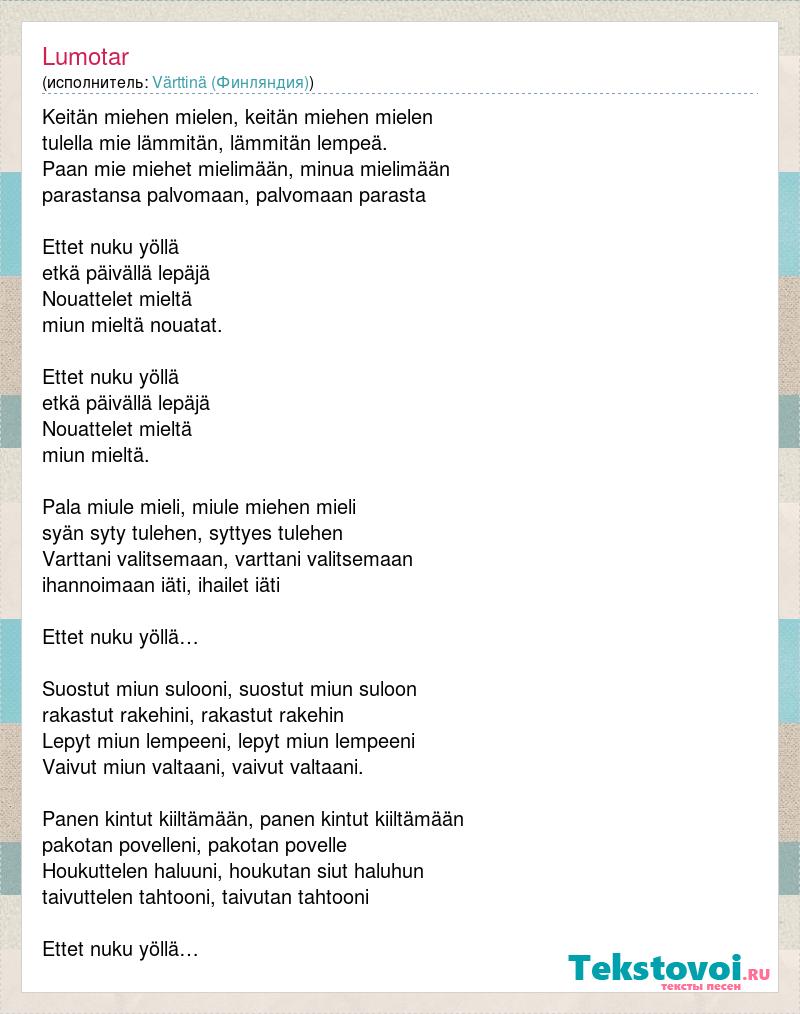 Keitän miehen mielen, keitän miehen mielen tulella mie lämmitän, lämmitän lempeä. Paan mie miehet mielimään, minua mielimään parastansa palvomaan, palvomaan parasta Ettet nuku yöllä etkä päivällä lepäjä Nouattelet mieltä miun mieltä nouatat. Ettet nuku yöllä etkä päivällä lepäjä Nouattelet mieltä miun mieltä. Pala miule mieli, miule miehen mieli syän syty tulehen, syttyes tulehen Varttani valitsemaan, varttani valitsemaan ihannoimaan iäti, ihailet iäti Ettet nuku yöllä… Suostut miun sulooni, suostut miun suloon rakastut rakehini, rakastut rakehin Lepyt miun lempeeni, lepyt miun lempeeni Vaivut miun valtaani, vaivut valtaani. Panen kintut kiiltämään, panen kintut kiiltämään pakotan povelleni, pakotan povelle Houkuttelen haluuni, houkutan siut haluhun taivuttelen tahtooni, taivutan tahtooni Ettet nuku yöllä…