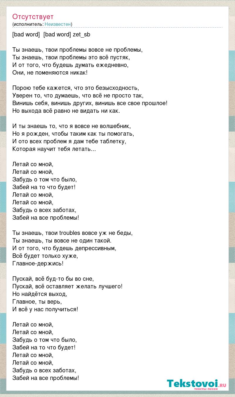 [bad word] [bad word] zet_sb Ты знаешь, твои проблемы вовсе не проблемы, Ты знаешь, твои проблемы это всё пустяк, И от того, что будешь думать ежедневно, Они, не поменяются никак! Порою тебе кажется, что это безысходность, Уверен то, что думаешь, что всё не просто так, Винишь себя, винишь других, винишь все свое прошлое! Но выхода всё равно не видать ни как. И ты знаешь то, что я вовсе не волшебник, Но я рожден, чтобы таким как ты помогать, И ото всех проблем я дам тебе таблетку, Которая научит тебя летать... Летай со мной, Летай со мной, Забудь о том что было, Забей на то что будет! Летай со мной, Летай со мной, Забудь о всех заботах, Забей на все проблемы! Ты знаешь, твои troubles вовсе уж не беды, Ты знаешь, ты вовсе не один такой. И от того, что будешь депрессивным, Всё будет только хуже, Главное-держись! Пускай, всё буд-то бы во сне, Пускай, всё оставляет желать лучшего! Но найдётся выход, Главное, ты верь, И всё у нас получиться! Летай со мной, Летай со мной, Забудь о том что было, Забей на то что будет! Летай со мной, Летай со мной, Забудь о всех заботах, Забей на все проблемы!