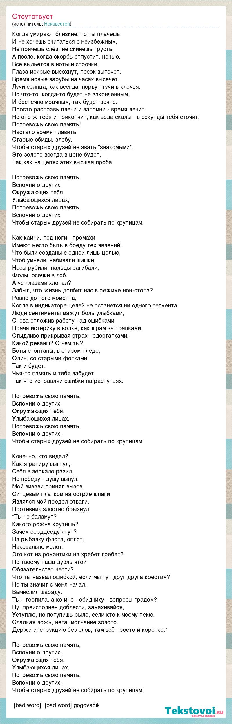 Когда умирают близкие, то ты плачешь И не хочешь считаться с неизбежным, Не прячешь слёз, не скинешь грусть, А после, когда скорбь отпустит, ночью, Все выльется в ноты и строчки. Глаза мокрые высохнут, песок вытечет. Время новые зарубы на часах высечет. Лучи солнца, как всегда, порвут тучи в клочья. Но что-то, когда-то будет не законченным. И беспечно мрачным, так будет вечно. Просто расправь плечи и запомни - время лечит. Но оно ж тебя и прикончит, как вода скалы - в секунды тебя сточит. Потревожь свою память! Настало время плавить Старые обиды, злобу, Чтобы старых друзей не звать "знакомыми". Это золото всегда в цене будет, Так как на цепях этих высшая проба. Потревожь свою память, Вспомни о других, Окружающих тебя, Улыбающихся лицах, Потревожь свою память, Вспомни о других, Чтобы старых друзей не собирать по крупицам. Как камни, под ноги - промахи Имеют место быть в бреду тех явлений, Что были созданы с одной лишь целью, Чтоб умнели, набивали шишки, Носы рубили, пальцы загибали, Фолы, осечки в лоб. А че глазами хлопал? Забыл, что жизнь долбит нас в режиме нон-стопа? Ровно до того момента, Когда в индикаторе целей не останется ни одного сегмента. Люди сентименты мажут боль улыбками, Снова отложив работу над ошибками. Пряча истерику в водке, как шрам за тряпками, Стыдливо прикрывая страх недостатками. Какой реванш? О чем ты? Боты стоптаны, в старом пледе, Один, со старыми фотками. Так и будет. Чья-то память и тебя забудет. Так что исправляй ошибки на распутьях. Потревожь свою память, Вспомни о других, Окружающих тебя, Улыбающихся лицах, Потревожь свою память, Вспомни о других, Чтобы старых друзей не собирать по крупицам. Конечно, кто видел? Как я рапиру выгнул, Себя в зеркало разил, Не победу - душу вынул. Мой визави принял вызов. Ситцевым платком на острие шпаги Являлся мой предел отваги. Противник злостно брызнул: "Ты чо баламут? Какого рожна крутишь? Зачем сердцееду кнут? На рыбалку флота, оплот, Наковальне молот. Это кот из романтики на хребет гребет? По твоему наша дуэль что? Обязательство чести? Что ты назвал ошибкой, если мы тут друг друга крестим? Но ты значит с меня начал, Вычислил шараду. Ты - терпила, а ко мне - обидчику - вопросы градом? Ну, преисполнен доблести, замахивайся, Уступлю, но потупишь рыло, если кто к моему пекю. Сладкая ложь, нега, молчание золото. Держи инструкцию без слов, там всё просто и коротко." Потревожь свою память, Вспомни о других, Окружающих тебя, Улыбающихся лицах, Потревожь свою память, Вспомни о других, Чтобы старых друзей не собирать по крупицам. [bad word] [bad word] gogovadik