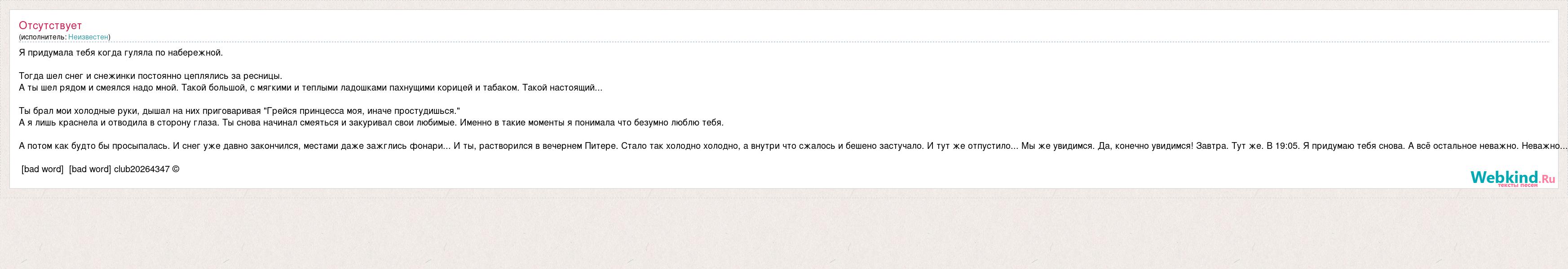 Я придумала тебя когда гуляла по набережной. Тогда шел снег и снежинки постоянно цеплялись за ресницы. А ты шел рядом и смеялся надо мной. Такой большой, с мягкими и теплыми ладошками пахнущими корицей и табаком. Такой настоящий... Ты брал мои холодные руки, дышал на них приговаривая "Грейся принцесса моя, иначе простудишься." А я лишь краснела и отводила в сторону глаза. Ты снова начинал смеяться и закуривал свои любимые. Именно в такие моменты я понимала что безумно люблю тебя. А потом как будто бы просыпалась. И снег уже давно закончился, местами даже зажглись фонари... И ты, растворился в вечернем Питере. Стало так холодно холодно, а внутри что сжалось и бешено застучало. И тут же отпустило... Мы же увидимся. Да, конечно увидимся! Завтра. Тут же. В 19:05. Я придумаю тебя снова. А всё остальное неважно. Неважно... [bad word] [bad word] club20264347 ©