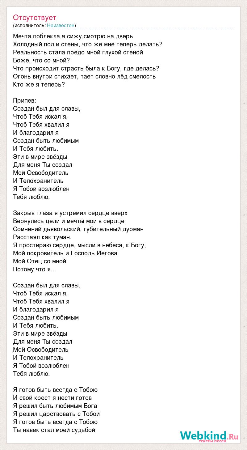 Мечта поблекла,я сижу,смотрю на дверь Холодный пол и стены, что же мне теперь делать? Реальность стала предо мной глухой стеной Боже, что со мной? Что происходит страсть была к Богу, где делась? Огонь внутри стихает, тает словно лёд смелость Кто же я теперь? Припев: Создан был для славы, Чтоб Тебя искал я, Чтоб Тебя хвалил я И благодарил я Создан быть любимым И Тебя любить. Эти в мире звёзды Для меня Ты создал Мой Освободитель И Телохранитель Я Тобой возлюблен Тебя люблю. Закрыв глаза я устремил сердце вверх Вернулись цели и мечты мои в сердце Сомнений дьявольский, губительный дурман Расстаял как туман. Я простираю сердце, мысли в небеса, к Богу, Мой покровитель и Господь Иегова Мой Отец со мной Потому что я... Создан был для славы, Чтоб Тебя искал я, Чтоб Тебя хвалил я И благодарил я Создан быть любимым И Тебя любить. Эти в мире звёзды Для меня Ты создал Мой Освободитель И Телохранитель Я Тобой возлюблен Тебя люблю. Я готов быть всегда с Тобою И свой крест я нести готов Я решил быть любимым Бога Я решил царствовать с Тобой Я готов быть всегда с Тобою Ты навек стал моей судьбой