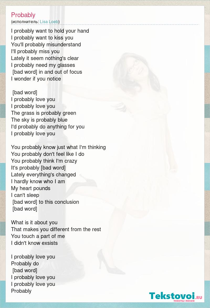 I probably want to hold your hand I probably want to kiss you You'll probably misunderstand I'll probably miss you Lately it seem nothing's clear I probably need my glasses [bad word] in and out of focus I wonder if you notice [bad word] I probably love you I probably love you The grass is probably green The sky is probably blue I'd probably do anything for you I probably love you You probably know just what I'm thinking You probably don't feel like I do You probably think I'm crazy It's probably [bad word] Lately everything's changed I hardly know who I am My heart pounds I can't sleep [bad word] to this conclusion [bad word] What is it about you That makes you different from the rest You touch a part of me I didn't know exsists I probably love you Probably do [bad word] I probably love you I probably love you Probably